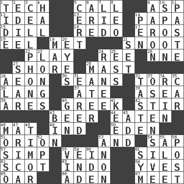 ACROSS 1. Technical 5. Give a ring to 9. Cleo's killer 12. It may be bright or harebrained 13. 4th largest of the Great Lakes 14. Dad 15. Deli pickle 16. Do over again 17. Greek god of love 18. Snakelike fish 19. Was introduced to 21. Snout, nose 22. Frolic 24. Portuguese money of account (variant) 26. Compass dir. 27. Dinah or Pauly 28. Vertical spar for supporting sails 29. Period of immesurable duration 30. Actors Connery and Penn 32. Torque (variant) 36. Austrian-born American filmmaker Fritz 37. Had dinner 38. Toward the sea 39. Ancient Greek god of war 40. Hellenic 42. Agitate 43. Fermented drink made from hops 44. Ingested 46. Floor covering 49. Working for oneself (abbr.) 50. Genesis locale 51. Constellation of myth 53. Added to 54. Plant excrement 57. Simple or foolish person 58. Distinctive style or manner 61. Grain storage tower 62. Native of Scotland 63. Southeast Asian peninsula 64. Jacques Cousteau's middle name 65. Boat paddle 66. Arabian gulf 67. Confront DOWN 1. Periodic rise and fall of the sea level 2. Singer Brickell 3. Portable communications device 4. Actor Linden 5. An absolute certainty 6. "We ___ not amused" (Victoria) 7. Flaplike covering 8. Lion 9. Composer Copland 10. Soup utensil 11. Thick mixture 14. Animal enclosure 19. Third mo. 20. Snake ____ (dice throw) 21. Arrange properly for use 23. Yearns 24. Indian princess (variant) 25. Curvy letter 27. Singe 28. Mother 29. In the manner of 31. Having ears or earlike features 32. Clothes sense 33. Clearly or manifestly demonstrative 34. It's straight from the horse's mouth 35. Automobile 40. Commissioned mil. rank 41. Peachy ____! 43. Storage container 45. Find the sum of 46. With motion or animation 47. N. Chile seaport 48. The easternmost of the Lesser Sundas 52. Elect 53. Soon (poet.) 55. Toward shelter 56. Mail 58. By way of 59. Conclusion 60. Binary compound 61. Symbol (abbr.)