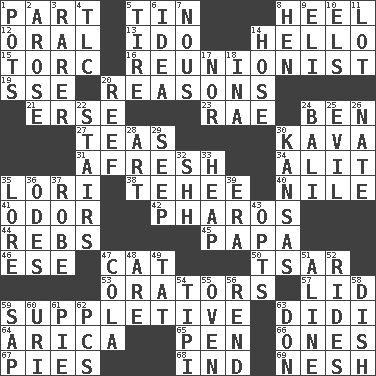 ACROSS 1. Component 5. Shallow baking pan 8. Person who is morally reprehensible 12. Relating to the mouth 13. Wedding promise 14. Phone greeting 15. Torque (variant) 16. One who advocates reunion 19. Compass dir. 20. Thinks logically 21. Celtic language 23. Actress Charlotte 24. Benjamin's nick name 27. Beverages made from leaves 30. Polynesian shrub of the pepper family 31. Anew 34. Set down 35. Australian parrot (variant) 38. Giggle 40. The longest river in the world 41. Scent 42. N Egypt peninsula 44. Confederate soldiers (slang) 45. Dad 46. Compass dir. 47. Domesticated feline 50. Russian ruler of old 53. Speakers 57. Flaplike covering 59. Supplying deficiencies 63. "You Light Up My Life" star Conn 64. N. Chile seaport 65. Animal enclosure 66. Washington bills 67. Sliced desserts 68. Working for oneself (abbr.) 69. Soft DOWN 1. Plant holders 2. Came up 3. Less widely known 4. Affectionate concern, for short 5. Hoop that covers a wheel 6. The content of cognition 7. Good sense 8. Layer 9. Biblical high priest 10. Raised railways 11. Car dealer's back yard 14. Flexible conduit 17. And not 18. _ tizzy (2 wds.) 20. Coral collection 22. Flight of steps 24. Indonesian resort city 25. Tending to cause great harm 26. Nathan's nickname 28. Tate display 29. Ooze 30. Sunflower state 32. Quiet! 33. Pile 35. Old wives' tales, e.g. 36. Lyric poems 37. Loose flowing garment 39. Epoch 43. Elects 47. Root beer relative 48. "We ___ not amused" (Victoria) 49. Make lace 51. Place in a line 52. Amusement-park features 54. Native american tent (variation) 55. Baking chamber 56. Tear apart 58. Food container 59. Plant excrement 60. RI univ. 61. Sliced dessert 62. Personal Computers (abbr.) 63. Spanish title