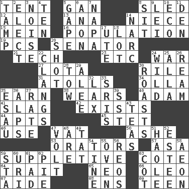 ACROSS 1. Portable shelter 5. Separate the seeds from cotton 8. Downhill vehicle 12. _ vera 13. Santa ___, CA 14. Sibling's daughter 15. Chow _ 16. Census information 19. Personal Computers (abbr.) 20. Elected representative 21. Technical work 23. And so on (abbr.) 24. Armed conflict 27. Globular water bottle used in Asia 30. Cause heat under the collar 31. Ringlike coral islands and reefs 34. Spanish pot 35. Merit 38. Puts on (as clothing) 40. First man 41. Volcanic refuse 42. Is 44. Tenement units (abbr.) 45. Proofreading order 46. Purpose 47. Large container 50. American tennis player Robert 53. Speakers 57. White ___ sheet 59. Supplementary 63. ____ d'Azur (French Riviera) 64. Distinguishing feature 65. Modern: prefix 66. Margarine 67. Helper 68. Followers of ems 69. Adolescent DOWN 1. Pack (down) 2. Opt 3. Annoying sound 4. "___ Little Indians" 5. Open wide 6. At once, immediately (arch.) 7. California wine valley 8. Be seated 9. Flowery wreath 10. Environmental prefix 11. Lair 14. Drug cop 17. Shoshoni 18. Car dealer's back yard 20. Went for two points 22. Rings like a ship's bell 24. Rampant 25. Silent film actress Nazimova 26. 480, 500 or 516 sheets of paper 28. Pull behind 29. Toward shelter 30. Ridicules or criticizes harshly 32. Not strict 33. Indian titles of respect 35. He sold his birthright 36. High mountains 37. Pace 39. Fast jet (abbr.) 43. Beverages made from leaves 47. Electrical Unit 48. "We ___ not amused" (Victoria) 49. Make lace 51. White Person, in Hawaii 52. First name in cosmetics 54. Prong on a fork 55. Baking chamber 56. Vintage cars 58. Period of immesurable duration 59. R.R. building 60. RI univ. 61. Writing tablet 62. Sliced dessert 63. Small bed