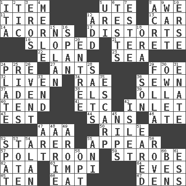 ACROSS 1. Detail 5. Shoshoni 8. Deep reverence 11. Hoop that covers a wheel 12. Ancient Greek god of war 13. Automobile 14. Oak nuts 17. What propaganda does 19. Inclined 21. Cigar-shaped 22. Style 23. Ocean 24. Before (prefix) 27. Pismires 29. Enemy 32. Make or become more lively 34. Actress Charlotte 36. Stitched 37. Arabian gulf 38. Raised railways 39. Rounded earthenware pot or jar 40. Be inclined (to) 41. And so on (abbr.) 42. An arm off of a larger body of water 43. Eastern Standard Time (abbr.) 44. Without 46. Had dinner 47. American Automobile Association (abbr.) 50. Cause heat under the collar 52. A viewer who gazes fixedly 55. Become visible 57. Coward 59. Disco prop 62. "One Day ___ Time" 63. Body of Kaffir warriors 64. Nights before holidays 65. "___ Little Indians" 66. Consume 67. Cub Scout units DOWN 1. Call ___ day 2. Nervous spasm 3. Greek god of love 4. Haggard of country music 5. RI univ. 6. Trials 7. First name in cosmetics 8. Measure of real estate 9. Electrical Unit 10. Celtic language 12. Find the sum of 15. Pitcher Ryan 16. Connect, as a bridge 18. Mouth or opening 20. Main course 24. Food holder 25. Amusement-park features 26. Happening 28. Table seasonings 29. Man or boy (slang) 30. A small or young owl 31. Related on the mother's side 33. Conclude 35. Fortification 36. Male offspring 42. Small island 45. Pinches, bites 47. Nonscientific branch of learning 48. Nest on high 49. Odor 51. Having ears or earlike features 52. Argument over a trivial matter 53. Carryall 54. Actor Alda or Thicke 55. Black tropical American cuckoo 56. Be footloose 58. Elect 60. Benjamin's nick name 61. Double-curved letter