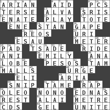 ACROSS 1. Believer in; advocate of (suffix) 6. Help 9. Personal Computers (abbr.) 12. Laconic 13. Inventor's middle name 14. Indian titles of respect 15. Related on the mother's side 16. Romp 17. Lug 18. Compass dir. 19. Comedian Laurel of Laurel & Hardy 20. Stare wonderingly 21. Vintage cars 23. RI univ. 24. He sold his birthright 25. Distance measurement 28. Groovy apt. 30. Sadhe (variant) 34. Travel on an animal 35. Black tropical American cuckoo 36. Poet Dickinson 38. Santa ___, CA 39. Ear part 41. Mexican monetary units 43. Scottish cap 44. Promenades 46. Goad 48. Connecticut Ivy Leaguer 49. Operatic vocal solo 50. Sever or remove by pinching or nipping 51. Not wild 53. Strike 56. Butter sub 57. Words to Nanette 58. Ferber et al. 60. Remainder 61. Jai ____ 62. Distance measurement (Brit.) 63. Music discs 64. Set 65. Join together DOWN 1. Had dinner 2. French philosopher Descartes 3. SW Asia republic 4. Michaelmas daisies 5. Born 6. Silent film actress Nazimova 7. "Terrible" tsar 8. 24 hours 9. Conciliate 10. Quote 11. Compass dir. 13. Tenement units (abbr.) 14. A viewer who gazes fixedly 19. Lush 20. Chewing product 22. Ingest 24. The property of being fit to eat 26. Pulitzer Prize-winning author Ferber 27. 480, 500 or 516 sheets of paper 28. Inside of hand 29. Small Philippine buffalo 31. Electrical Unit 32. Expire 33. Raised railways 37. You are 40. American author Paul (1891-1958) 42. _ Lanka 45. Small drink 47. Place where plants grow 49. Mine, in Marseilles 50. Downhill vehicle 51. Lacquered or enameled metalware 52. Of or related to the anus 54. Against 55. Piece 56. The grampus (Milton) 57. Tired old horse 58. Australian flightless bird 59. Perceive with the eye
