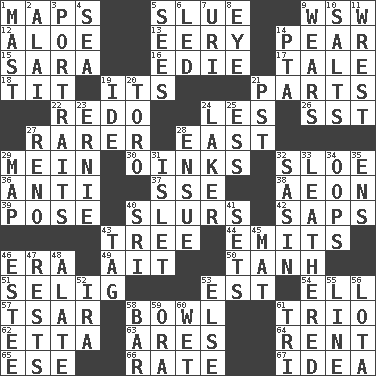 ACROSS 1. Atlas contents 5. Turn sharply 9. Compass dir. 12. _ vera 13. Suggestive of the supernatural 14. Lightbulb-shaped fruit 15. "Two Mules for Sister ____" 16. Singer Brickell 17. Lie 18. Teat (slang) 19. ___ a Wonderful Life 21. Components 22. Redecorate 24. French article 26. Fast jet (abbr.) 27. More valued for its uncommonness 28. 90 degrees 29. Chow _ 30. Pig sounds 32. _ gin 36. Opposed to 37. Compass dir. 38. Period of immesurable duration 39. Introduce or present, as a question 40. Runs notes together 42. Plant excrements 43. Family _ (genealogy) 44. Gives off 46. Epoch 49. Small island 50. Hyperbolic tangent 51. Former Milwaukee Brewers owner Bud 53. Eastern Standard Time (abbr.) 54. Pipe bend 57. Russian ruler of old 58. Soup holder 61. Musical group of three 62. Singer James 63. Ancient Greek god of war 64. Monthly bill 65. Compass dir. 66. Pace 67. The content of cognition DOWN 1. Vertical spar for supporting sails 2. Jai ____ 3. Likenesses of persons 4. Ocean 5. Perceives with the eye 6. Directed 7. RI univ. 8. Sight organ 9. Erodes 10. Table seasonings 11. Take or capture by force 14. Parent Teacher Assoc. 19. Binary compound 20. "Corrida" creature 21. Pacific Standard Time (abbr.) 23. Bert's buddy 24. Member of a famous L.A. basketball team 25. Double-curved letter 27. Former U.S. Attorney General Janet 28. Take place subsequently 29. Atlas unit 31. Small island 32. Indian antelope 33. Resembling or made to resemble leather 34. I made a mistake 35. Followers of ems 40. _ Lanka 41. Arranges properly for use 43. Label 45. Floor protector 46. First name in cosmetics 47. Musical pauses 48. Having winglike extensions 52. Retirement account (abbr.) 53. Otherwise 55. Actor's bit 56. Globular water bottle used in Asia 58. Tavern 59. Mouth or opening 60. Soggy 61. Three (prefix)
