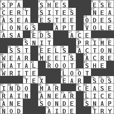 ACROSS 1. Health resort 4. "______ My Girl" (Turtles hit) 8. Compass dir. 11. An absolute certainty 13. Locates 15. Teachers' org. 16. At sea 17. First name in cosmetics 18. Lyric poems 19. Yearns 21. Fitting 22. Short-tailed, large-bodied rat 23. White ___ sheet 24. Begley and Asner 27. Adept person 29. In a ____ (agitated or irritated) 30. A-one 34. Fast jet (abbr.) 36. Snakelike fish 39. 13-14th century defensive garment 40. Put on (as clothing) 41. Confronts 43. 43,560 square feet 44. Brizilian seaport 46. Carrot, for example 47. A female animal or person 48. Compose 49. Spoils 51. John Ritter's dad 53. Hearing organ 54. Distress signal 57. Southeast Asian peninsula 60. Make imperfect 63. Desist 65. Water falling in drops from the sky 66. Approach 69. Louse (plural) 70. One (Scot) 71. Something which is sent 72. Fastener 73. Allow head to fall sleepily 74. Helper 75. Attempt DOWN 1. Any of the three canals of the cochlea 2. Mexican monetary units 3. Sports stadium 4. Compass dir. 5. Part of HMS, perhaps 6. Singer James 7. Ooze 8. Inside; within (prefix) 9. Stitch closed the eyes of (a falcon) 10. Comfort 12. Label 14. Bristle 18. Cloudy 20. Elected rep. 25. South Vietnam president (1954) 26. Bull 28. Accounting whiz (abbr.) 29. Ski resort town in Vermont 31. Hankering 32. Greater amount 33. Compass dir. 34. Scorch 35. Suttee (variant) 37. Lion 38. Took without asking 40. Compass dir. 42. Portico 45. Area sheltered from the wind 50. The grampus (Milton) 52. Dec. holiday 54. Inhabitant of Heaven 55. Witty Wilde 56. Oozy 57. SW Asia republic 58. Billionth: prefix 59. Passed on 61. Small Philippine buffalo 62. Painter Guido (1575-1642) 64. Raised railways 67. Increase 68. To riddle