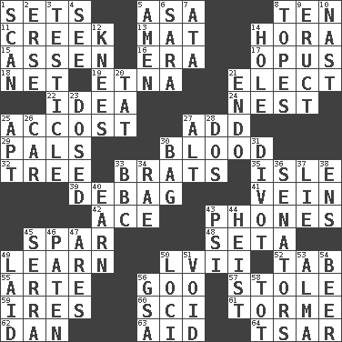 ACROSS 1. Arranges properly for use 5. White ___ sheet 8. Nine, plus one 11. Small stream 13. Floor protector 14. Israeli folk dance 15. NE Netherlands city 16. Epoch 17. Musical composition 18. Remaining after all deductions 19. Inactive volcano in Sicily 21. Opt 22. It may be bright or harebrained 24. A home for chicks 25. Buttonhole 27. Find the sum of 29. Friends 30. Vital fluid 32. Woody plant 33. Naughty children 35. Capri or Wight 39. Debunk (Brit. slang) 41. Distinctive style or manner 42. Adept person 43. Gives a jingle 45. Coast Guard woman 48. Bristle 49. Acquire or gain knowledge or skills 50. 57 in ancient Rome 52. Keyboard key 55. Johnson of "Laugh-In" 56. Thick or sticky substance 57. Took without asking 59. Angers 60. _-fi 61. Singer Mel 62. Daniel's nick name 63. Help 64. Russian ruler of old DOWN 1. Examine minutely or intensely 2. Celtic language 3. A testis 4. Perceive with the eye 5. So be it 6. "Two Mules for Sister ____" 7. _ moment's notice (2 wds.) 8. Drinks excessively 9. Spew [out] 10. Political cartoonist Thomas 12. Leg joints 14. Opening into or through something 20. Make lace 21. Inside; within (prefix) 23. Administered medicine 25. Fitting 26. 4-wheeled motor vehicle 27. The first octave above the treble staff 28. Two (Sp.) 30. Container for groceries 31. A piece of turf (Scot.) 33. English channel? 34. Actress Charlotte 36. Elected representatives 37. Falsehood 38. Followers of ems 40. Merit 43. Air pressure measure (abbr.) 44. Robbery 45. Father Junipero _ 46. Eucharist need 47. Ancient Greek god of war 49. Put down 50. Locales 51. Null 53. _ mater 54. Fermented drink made from hops 56. Girls' org. (abbr.) 58. Small child