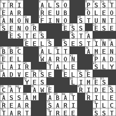 ACROSS 1. Three (prefix) 4. In addition 8. Inconspicuous attention getter 12. Hearing organ 13. Reuben's nickname 14. Margarine 15. Soon (poet.) 17. A pale, very dry sherry 18. Difficult or unusual or dangerous feat 19. Sir (Sp.) 21. Curvy letter 23. Compass dir. 24. _____ Park, CO 26. R.R. building 28. Snakelike fish 30. French poetic form 34. English channel? 37. Set down 39. So be it 40. Snakelike fish 41. Make _____ (do battle with) 43. Groovy apt. 44. Den 46. Story 47. Roguish 48. Contrary to your interests or welfare 51. Otherwise 54. Consenting reply 55. Citrus fruits 58. Domesticated feline 61. Deep reverence 63. Amusement-park features 65. Indian state 67. Blind as ____ 71. Cause heat under the collar 72. Hitchcock's "____ Window" 73. Indian skirt 74. Affectionate concern, for short 75. Small pie 76. Woody plant 77. Fast jet (abbr.) DOWN 1. Afternoon social gatherings 2. The wife of a rajah (variant) 3. Removes the wrinkles 4. Sandy's bark 5. Luau accessory 6. Player for Phoenix 7. Mitch Miller's instrument 8. Cooking vessel 9. Turn sharply 10. Elected reps. 11. Carryall 16. Observe 18. Fast planes 20. To sift 22. Compass dir. 25. Cole _ (cabbage dish) 27. "One Day ___ Time" 29. Chalkboard 30. Took without asking 31. Naughty children 32. Be tempered by heat 33. Actor Griffith 34. Actor Lugosi 35. Necklace unit 36. 154 in Roman numerals 38. Lyricist Gershwin 42. 1994 drama film starring Jodie Foster 45. Marina Del _, California 49. 480, 500 or 516 sheets of paper 50. Compass dir. 52. Title for a knight 53. Independent ruler or chieftain 56. Proofreads 57. Makes a sale 58. Haul 59. Toward the sea 60. Russian ruler of old 62. 90 degrees 64. Religious group 66. Tate display 68. Soap unit 69. "We ___ not amused" (Victoria) 70. Make a knot
