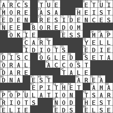 ACROSS 1. Curves 5. Third day of the wk. 8. Needle case 12. Greater amount 13. White ___ sheet 14. Robbery 15. Genesis locale 16. Homes 19. Born 20. Mood resulting from idleness 21. Migrant worker of the '30s 23. Double-curved letter 24. Atlas unit 27. Haul 30. Shout 31. Foolish or stupid persons 34. Singer Brickell 35. Compact _ 38. Stared 40. Stalk of a moss capsule 41. Spoken 42. Buttonhole 44. Have the gumption 45. Lie 46. Heredity factor (abbr.) 47. Eastern Standard Time (abbr.) 50. Length times width 53. Curse 57. Wet nurse (var.) 59. Census information 63. Russian ruler of old 64. Disturbances 65. Lower and raise head in agreement 66. Behest 67. Writer Wiesel 68. Begley and Asner 69. Otherwise DOWN 1. So be it 2. Cowboy competition 3. Small stream 4. Elected rep. 5. Edible starchy tuberous root 6. One who uses or employs something 7. Comfort 8. Car or cant ending 9. Nervous spasm 10. Purpose 11. It is 14. Equivocates 17. Binary compound 18. Two (Sp.) 20. Necklace unit 22. Ice on the eave 24. Ancient Persian 25. Set down 26. Entreaty 28. _ de Janeiro 29. Ancient Roman robe 30. Next before 32. Affectionate concern, for short 33. Religious group 35. Texas town _ City 36. SW Asia republic 37. "Two Mules for Sister ____" 39. ___ good deed 43. Narrow board 47. Snakelike fish 48. Health resort 49. Teat (slang) 51. Artist's stand 52. Collect or gather 54. Prong on a fork 55. Parka part 56. Extremities 58. Johnson of "Laugh-In" 59. Before (prefix) 60. Petroleum 61. Luau course 62. Shoshoni 63. Definite Article