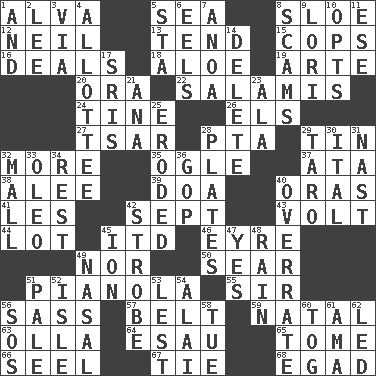 ACROSS 1. Inventor's middle name 5. Ocean 8. A type of plum 12. Famous astronaut Armstrong 13. Be inclined (to) 15. 911 reaches them 16. Allots cards 18. Medicinal plant 19. Johnson of "Laugh-In" 20. Mouth or opening 22. Deli grouping 24. Prong on a fork 26. Raised railways 27. Russian ruler of old 28. Parent Teacher Assoc. 29. Shallow baking pan 32. Greater amount 35. Stare 37. "One Day ___ Time" 38. Toward shelter 39. ___ good deed 40. Mouths or openings 41. French article 42. Back-to-school mo. 43. Electrical Unit 44. Car dealer's back yard 45. It would 46. Jane of fiction 49. And not 50. Shrivel 51. Player piano 55. Title for a knight 56. Backtalk 57. Waist strap 59. Brizilian seaport 63. Water jar 64. He sold his birthright 65. Heavy book 66. Stitch closed the eyes of (a falcon) 67. Make a knot 68. Mild oath DOWN 1. Added to 2. Area sheltered from the wind 3. By way of 4. One to whom something is allotted 5. R.R. building 6. Snakelike fish 7. Small Philippine buffalo 8. Fraudulent business schemes 9. Australian parrot (variant) 10. Chooses 11. Compass dir. 14. Keyboard key 17. Indian titles of respect 21. Santa ___, CA 23. Chicken ___ king 25. Worn away 28. Food holders 29. Edible starchy tuberous root 30. Slanted text style (abbr.) 31. Political cartoonist Thomas 32. Promenade 33. Margarine 34. Repose 36. Grand Old Party 40. Make much ado about nothing 42. Disco prop 45. Electrically charged atom 47. Consenting reply 48. Precipitation 49. Relating to the nose 51. Light colored 52. Small island 53. For fear that 54. Mountain range southwest of Kyrgyzstan 56. Distress signal 58. Third day of the wk. 60. Coat; cloak 61. Nanny (var.) 62. Directed