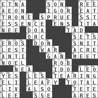 ACROSS 1. Inactive volcano in Sicily 5. Male child 8. To sift 11. Period of immesurable duration 12. Russian composer Stravinsky 14. Ingest 15. Heavy duty weighing machine 17. Upset 18. Fast jet (abbr.) 19. Substance 21. Followers of ems 22. Call ___ day 23. Born 24. ___ good deed 25. Bit 27. The grampus (Milton) 28. Arranges properly for use 31. Greek god of love 35. Spanish title 37. In a ____ (agitated or irritated) 38. For fear that 39. Armed conflict 41. Measure of real estate 42. Opposed to 43. Separate the seeds from cotton 45. Rendezvous 46. Christmas carol 47. Director Reiner 49. Teachers' org. 51. Wedding promise 52. Lion 55. Affirmative reply 57. French article 60. Pulling into pieces 62. Biblical high priest 63. Like summer trees 65. Add up to 66. 54 in ancient Rome 67. In addition 68. Wig 69. Area sheltered from the wind 70. Compass dir. 71. Ancient Greek god of war DOWN 1. Consumed 2. Laconic 3. Trap for birds or small mammals 4. Singer Murray 5. Small drink 6. Legendary monster 7. Part of speech 8. Dwelling 9. Compass direction 10. Singer James 13. Repose 16. Inside; within (prefix) 17. Manatee 20. Drawstring 26. Indian state 29. Become fatigued 30. Proofreading order 31. Style 32. Former U.S. Attorney General Janet 33. Clearly or manifestly demonstrative 34. Vertical member of a panel or frame 36. Tired old horse 40. Noteworthy scarcity 44. Connecting point 48. Water vessel 50. Silent film actress Nazimova 52. 61 cubic inches 53. Related on the mother's side 54. Stares at amorously 55. Shout 56. Writer Wiesel 58. Snakelike fish 59. Backtalk 61. Round or rotation of duties 64. Enemy