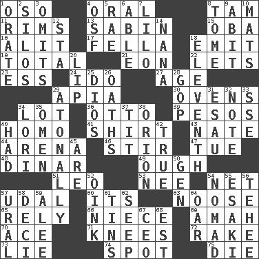 ACROSS 1. Bear (Spanish) 4. Taken by mouth 8. Scottish cap 11. Basketball hoops 13. Unit of acoustic absorption 15. Chief or king in Benin or Nigeria 16. Set down 17. Chap (slang) 18. Send forth 19. "_____ Recall" 21. Period of immesurable duration 22. Allows 23. Double-curved letter 24. Wedding promise 27. Grow older 29. Capital of Western Samoa 30. Baking chambers 34. Car dealer's back yard 36. "Beetle Bailey" pooch 39. Mexican monetary units 40. Same (prefix) 41. Chest covering 43. Nathan's nickname 44. Sports stadium 46. Tumult 47. Third day of the wk. 48. Middle Eastern gold or silver currency 49. Ending for "Through" and "Enough" 51. Lion 53. Born 54. Fish or hair follower 57. Freehold land 60. ___ a Wonderful Life 63. Trap for birds or small mammals 65. Have trust in 66. Sibling's daughter 69. Housemaid 70. Adept person 71. Leg joints 72. Libertine 73. Whopper 74. Specific locale 75. Pass on DOWN 1. Declaim 2. Grain storage towers 3. Leaves out 4. Order of Saint Francis (abbr.) 5. Actress Charlotte 6. Competent 7. _ and Stitch 8. Heavy book 9. "This won't hurt ____!" 10. Floor coverings 12. R.R. building 14. Grandmother 18. Veterans Day date 20. Mouth edge 25. "Vaya con ____" 26. Profane or obscene expressions 28. Republican Party 29. Without tonality 31. He sold his birthright 32. Short letter 33. Compass dir. 34. Australian parrot (variant) 35. Presage 37. Teat (slang) 38. Greek mythologigal hunter 40. Possessed 42. Loyal 45. "We ___ not amused" (Victoria) 50. Commissioned military rank (abbr.) 52. Pig sound 54. Wanderer 55. 1973 Nobel Price Winner (Physics) Leo 56. Giggle 57. Mountain range 58. Tenth: prefix 59. Toward shelter 61. Canisters 62. Ooze 64. Rowing implement 67. Corporate head (abbr.) 68. Eastern Standard Time (abbr.)