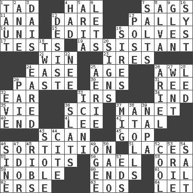 ACROSS 1. Small boy 4. Actor Linden 7. Settles 11. Santa ___, CA 12. Have the gumption 13. Chummy 14. Single; one (prefix) 15. Prepare for publication 16. Finds the solution 17. Trials 19. Aide 21. Victory 23. Angers 24. Comfort 25. Ripen 26. Leather borer 29. Thick mixture 30. Followers of ems 31. To riddle 32. Hearing organ 33. Big collection agency 34. Working for oneself (abbr.) 35. Compete 36. _-fi 37. French painter Edouard 40. Conclude 41. Area sheltered from the wind 42. Slanted text style (abbr.) 43. Glance over 45. Grand Old Party 46. Casting lots 51. Shoestrings 55. Foolish or stupid persons 56. Highlander 58. Mouth or opening 59. Having high moral qualities 60. Extremities 61. Lubricate 62. Celtic language 63. Greek goddess of the dawn 64. Allow DOWN 1. Strained 2. Queen of England 1702-14 3. Raised platform 4. Possessed 5. Operatic vocal solo 6. Allows 7. Table seasonings 8. Inventor's middle name 9. Small, secluded valley 10. System (abbr.) 12. Cease 13. Introduce or present, as a question 16. Titles for men of rank and authority 18. It was, poetically 20. Signals 22. Born 24. Having ears or earlike features 25. Nest on high 26. Satellite of Uranus 27. Left 28. Directed 29. Ache 32. First lady 33. Ancient Celtic tribe of eastern Britain 36. Narrow boards 37. Russian fighter aircraft 38. Ringlike coral islands and reefs 39. California wine valley 43. Took without asking 44. Quote 46. Trig term 47. Scent 48. Teases 49. Double curve, resembling the letter S 50. Billionth: prefix 52. Calm and collected 53. 4th largest of the Great Lakes 54. Table seasoning 57. Begley and Asner