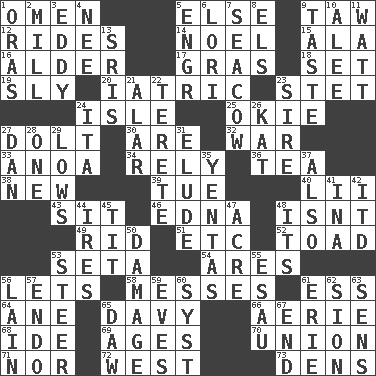 ACROSS 1. Sign of things to come 5. Otherwise 9. The 23rd letter of the Hebrew alphabet 12. Amusement-park features 14. Christmas carol 15. Insect wing 16. Tree or shrub in the Birch family 17. Pate de foie ____ 18. Arrange properly for use 19. Wily 20. Of or pertaining to medicine 23. Proofreading order 24. Capri or Wight 25. Migrant worker of the '30s 27. Dunce 30. "We ___ not amused" (Victoria) 32. Armed conflict 33. Small Philippine buffalo 34. Depend 36. Afternoon social gathering 38. ___ Haven, CT 39. Third day of the wk. 40. Cards in a Roman deck? 43. Be seated 46. Pulitzer Prize-winning author Ferber 48. Is not 49. To free from 51. And so on (abbr.) 52. Frog relative 53. Bristle 54. Ancient Greek god of war 56. Allows 58. Makes clutter 61. Curvy letter 64. One (Scot) 65. American folk hero Crockett 66. Nest on high 68. Binary compound 69. Eons 70. The state of being joined or united 71. Not either 72. Compass direction 73. Hiding places for outlaws DOWN 1. Mouths or openings 2. Place where flour is made 3. Whirlpool 4. Born 5. Engineer (abbr.) 6. Australian parrot (variant) 7. Manatee 8. Raised railways 9. Clothes sense 10. Toward shelter 11. Electrical Unit 13. Indian titles of respect 21. Having or resembling wings 22. Cigar-shaped 23. The founder of a family 24. Call ___ day 26. Krazy ___ of comics 27. Daniel's nick name 28. Single 29. Moos 31. Evade 35. Gossips 37. In addition 41. _ tizzy (2 wds.) 42. It would 44. Angers 45. Teat (slang) 47. 43,560 square feet 48. ___ a Wonderful Life 50. Break 53. Bull 55. Son of Isaac 56. (Had) reclined 57. Inside; within (prefix) 59. Nights before holidays 60. System (abbr.) 61. One of the Great Lakes 62. The Jewish people; Israel 63. Elected reps. 65. Obsolete 67. Conclusion