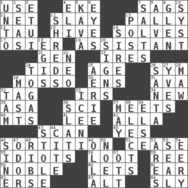 ACROSS 1. Purpose 4. Supplement with great effort 7. Droops 11. Remaining after all deductions 12. Kill 13. Chummy 14. The 19th letter of the Greek alphabet 15. Hub of activity 16. Finds the solution 17. Flexible twig of a willow tree 19. Helper 21. Commissioned military rank (abbr.) 23. Angers 24. Periodic rise and fall of the sea level 25. Grow older 26. Symbol (abbr.) 29. With motion or animation 30. Followers of ems 31. Actress Gardner 32. Label 33. Big collection agency 34. ___ Haven, CT 35. White ___ sheet 36. _-fi 37. Confronts 40. Mountains (abbr.) 41. Area sheltered from the wind 42. Silent film actress Nazimova 43. Glance over 45. It is so 46. Conclusion 51. Stop 55. Foolish or stupid persons 56. Plunder 58. Portuguese money of account (variant) 59. Having high moral qualities 60. Allows 61. Ewer handle 62. Celtic language 63. The first octave above the treble staff 64. Cunning DOWN 1. To (old English) 2. Oceans 3. Needle case 4. Biblical high priest 5. Polynesian shrub of the pepper family 6. Sight organs 7. Table seasonings 8. Inventor's middle name 9. Small, secluded valley 10. System (abbr.) 12. Tears up 13. Introduce or present, as a question 16. Male parents of animals 18. Armor plate that protects the chest 20. Signals 22. Modern: prefix 24. Ancient Roman robes 25. Nest on high 26. Before Barbara or Clara 27. Jacques Cousteau's middle name 28. Informal term for the mouth 29. Vertical spar for supporting sails 32. Scottish cap 33. Ancient Celtic tribe of eastern Britain 36. Narrow boards 37. Fifth month 38. Opts 39. Otherwise 43. Took without asking 44. Quote 46. Trig term 47. Scent 48. Chest bones 49. Spanish pot 50. Christmas carol 52. Ancient Greek god of war 53. Lick closed 54. Suggestive of the supernatural 57. Baseball player Mel