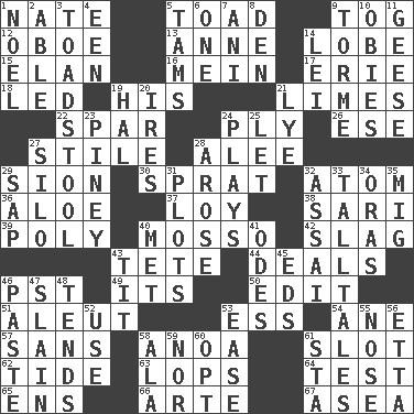 ACROSS 1. Nathan's nickname 5. Frog relative 9. Coat; cloak 12. Mitch Miller's instrument 13. Singer Murray 14. Ear part 15. Style 16. Count _ (2 wds.) 17. 4th largest of the Great Lakes 18. Directed 19. Part of HMS, perhaps 21. Citrus fruits 22. Coast Guard woman 24. Apply oneself diligently 26. Compass dir. 27. Vertical member of a panel or frame 28. Toward shelter 29. The Jewish people; Israel 30. Small fatty European fish 32. Smallest unit of an element 36. _ vera 37. Myrna of the movies 38. Indian skirt 39. Many (prefix) 40. With motion or animation 42. Volcanic refuse 43. Wig 44. Allots cards 46. Pacific Standard Time (abbr.) 49. ___ a Wonderful Life 50. Prepare for publication 51. Native American of Southwest Alaska 53. Curvy letter 54. A saturated hydrocarbon 57. Without 58. Small Philippine buffalo 61. Position in a hierarchy or organization 62. Event that recurs at intervals 63. Chops off 64. Trial 65. Followers of ems 66. Johnson of "Laugh-In" 67. At sea DOWN 1. Christmas carol 2. Competent 3. Inedible or poisonous agaric 4. Car or cant ending 5. Scottish caps 6. Single 7. Black tropical American cuckoo 8. Lair 9. Singer Mel 10. Off-Broadway awards 11. Honkers 14. Flowery wreath 19. Actor Linden 20. Angers 21. Sodium hydroxide 23. Abounding in pines 24. Romps 25. Allow 27. Grain storage tower 28. Came up 29. Plant excrement 31. Schemes 32. Slender Brazilian palm 33. Baron Munchausen's specialties 34. Mouths or openings 35. Russian fighter aircraft 40. Was introduced to 41. Lyric poems 43. Teat (slang) 45. Begley and Asner 46. Thick mixture 47. Killed 48. Is inclined (to) 52. Purpose 53. Relaxation 55. Olfactory organ 56. Singer James 58. According to 59. And not 60. Elect 61. R.R. building