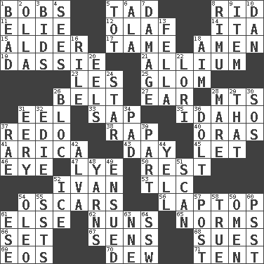 ACROSS 1. Moves up and down 5. Bit 8. To free from 11. Writer Wiesel 12. Norwegian king 14. Call ___ day 15. Tree or shrub in the Birch family 17. Not wild 18. So be it 19. Hyrax 21. Plant genus of onion and garlic 23. French article 25. Seize upon or latch onto something 26. Waist strap 27. Ewer handle 28. Mountains (abbr.) 31. Snakelike fish 33. Plant excrement 35. Potato state 37. Redecorate 38. Reproach for some lapse or misdeed 40. Mouths or openings 41. N. Chile seaport 43. 24 hours 45. Allow 46. Sight organ 47. Potassium hydroxide 50. Remainder 52. _ the terrible 53. Affectionate concern, for short 54. Motion picture awards 56. Portable computer 61. Otherwise 62. Religious women 65. Typical models 66. Put into a specified state 67. Elected reps. 68. Takes to court 69. Greek goddess of the dawn 70. Morning condensation 71. Portable shelter DOWN 1. Necklace unit 2. Water jar 3. Auction offers 4. Perceives with the eye 5. Small child 6. Insect wing 7. Break 8. Tall New Zealand timber tree 9. A distinct part 10. One of the 12 tribes of Israel 13. Chap (slang) 16. Cause heat under the collar 18. Direct toward a target or goal 20. Snakelike fish 22. Australian parrot (variant) 24. Play the lead 26. Alliance 28. Female horse 29. Not this but _ 30. Distress signal 31. Suggestive of the supernatural 32. Singer Brickell 34. Groovy apt. 36. Dunce 37. Actress Charlotte 39. Piece 42. Inventor's middle name 44. Shout 48. Tall tales 49. Followed as a consequence or result 51. Examine minutely or intensely 52. Frozen water 54. Margarine 55. Fast planes 57. Mail 58. Loyal 59. Sign of things to come 60. Inconspicuous attention getter 61. Compass dir. 63. Compass dir. 64. Compass dir.
