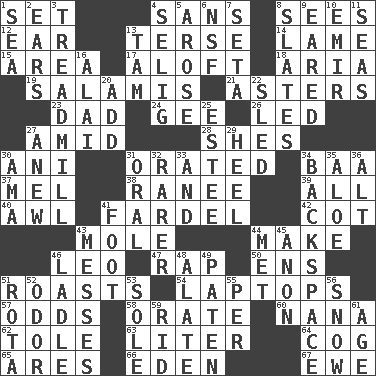 ACROSS 1. Put into a specified state 4. Without 8. Observes 12. Hearing organ 13. Laconic 14. Unable to walk 15. Type of rug 17. Upward 18. Roberta Peters solo 19. Deli grouping 21. Michaelmas daisies 23. Male parent 24. Unit of force equal to gravity 26. Directed 27. Among 28. "______ My Girl" (Turtles hit) 30. Cuckoo 31. Declaimed 34. Sound made by sheep 37. Cartoonist voice _ Blanc 38. Indian princess (variant) 39. Everything 40. Leather borer 41. Bundle 42. Small bed 43. Undercover agent 44. Create 46. Lion 47. Strike 50. Followers of ems 51. Cooks with dry heat, as in an oven 54. Portable computers 57. Likelihood 58. Speak pompously 60. Nanny 62. Lacquered or enameled metalware 63. 61 cubic inches 64. Gear tooth 65. Ancient Greek god of war 66. Genesis locale 67. She-sheep DOWN 1. Ocean 2. Hearing organs 3. Excercise machine 4. Major League Baseball Commissioner Bud 5. Came up 6. Science/research agcy. 7. Stalk of a moss capsule 8. Chalkboards 9. Having ears or earlike features 10. Arab leader 11. Oceans 13. Scottish cap 16. Mountain range southwest of Kyrgyzstan 20. Find the sum of 22. Downhill vehicle 25. First name in cosmetics 27. Afresh 29. The bottom of a shoe or boot 30. Nursemaid (var.) 31. Taken by mouth 32. More uncommon 33. Also 34. Keyboard key 35. Medicinal plant 36. The first octave above the treble staff 41. Pick up the tab 43. Makes clutter 44. Was introduced to 45. Soon (poet.) 46. Dipping utensil 48. Having winglike extensions 49. Eucharist need 51. Roll call or roster of names 52. Aroma 53. Flatfish 55. For each 56. Frozen precipitation 59. To free from 61. Grow older