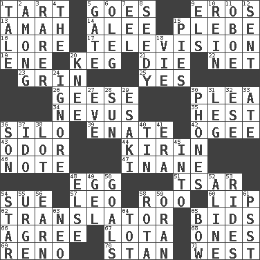 ACROSS 1. Small pie 5. Moves 9. Greek god of love 13. Nursemaid 14. Toward shelter 15. Military trainee 16. Old wives' tales, e.g. 17. Boob tube 19. Compass dir. 20. Cask 21. Expire 22. Fish or hair follower 23. Broad smile 25. Consenting reply 26. Honkers 30. Entreaty 34. Congenital growth or mark on the skin 35. Command 36. Grain storage tower 39. Related on the mother's side 42. Double curve, resembling the letter S 43. Scent 44. Japanese brewing company 46. Short letter 47. Silly 48. Ovum 51. Russian ruler of old 54. Institute legal proceedings 57. Lion 58. Friend of Pooh 60. Mouth edge 62. Interpreter 65. Auction offers 66. Match 67. Globular water bottle used in Asia 68. Singles 69. Former U.S. Attorney General Janet 70. Comedian Laurel of Laurel & Hardy 71. 270 degrees DOWN 1. Story 2. Amid 3. More valued for its uncommonness 4. Definite Article 5. Yard entry 6. Cassini of fashion 7. Snakelike fish 8. Shabby and untidy 9. Raised railways 10. It's straight from the horse's mouth 11. Mitch Miller's instrument 12. Transmitted 15. Sliced desserts 18. Compete 20. Leg joint 24. Disregard 27. First lady 28. Player for Phoenix 29. 1973 Nobel Price Winner (Physics) Leo 30. Gives a jingle 31. Part of a journey 32. Compass dir. 33. Had dinner 36. Boy, to dad 37. Wedding promise 38. Car dealer's back yard 40. Shallow baking pan 41. Period 45. To the inside or interior of 48. Otherwise 49. Set 50. Scores awarded for successful feats 52. Place in a line 53. Amusement-park features 54. Play the lead 55. Goad 56. Merit 58. Round or rotation of duties 59. Northwest Algerian city 61. Inconspicuous attention getter 63. Modern: prefix 64. Small child 65. Arrow shooter