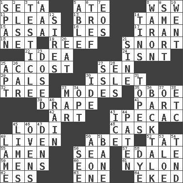 ACROSS 1. Stalk of a moss capsule 5. Had dinner 8. Compass dir. 11. Entreaties 13. Sis' sibling 14. Docile 15. Slender Brazilian palm 16. French article 17. SW Asia republic 18. Remaining after all deductions 19. Coral ridge 21. Derisive sound 22. It may be bright or harebrained 24. Is not 25. Buttonhole 27. Elected rep. 29. Friends 30. Small island 32. Relationship diagram 33. Methods 35. Mitch Miller's instrument 39. Window treatment 41. Piece 42. Nonscientific branch of learning 43. Medicinal drug used to evoke vomiting 45. Farming town in central California 48. Keg 49. Make or become more lively 50. Collude with 52. Make lace 55. So be it 56. Ocean 57. Peak District village in England 59. Not women's 60. A really long time 61. Thermoplastic polyamide 62. Double-curved letter 63. Compass dir. 64. Made supply last DOWN 1. Connect, as a bridge 2. Otherwise 3. One of the two male reproductive glands 4. Auto club (abbr.) 5. Competent 6. Unclean, religiously 7. Greek goddess of the dawn 8. Make _____ (do battle with) 9. Don Adams' spy role 10. Gone 12. Titles for men of rank and authority 14. Metal containers 20. Erode 21. Trig term 23. Administered medicine 25. Fitting 26. Auto 27. Compass dir. 28. Raised railways 30. Binary compound 31. Drinks excessively 33. Spoil 34. Elect 36. Sass 37. Mouth or opening 38. And so on (abbr.) 40. Precipitation 43. Frozen water 44. Eucharist need 45. Citrus fruits 46. Baking chambers 47. Habitations of wild animals 49. Unable to walk 50. Period of immesurable duration 51. Object of repulsion 53. _ vera 54. Be inclined (to) 56. Perceive with the eye 58. Color