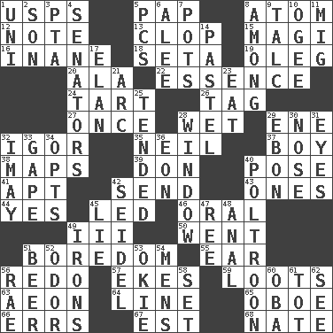 ACROSS 1. United States Postal Service (abbr.) 5. Infant food 8. Smallest unit of an element 12. Brief written record 13. Hoof sound 15. Wise men 16. Silly 18. Bristle 19. Cassini of fashion 20. Chicken ___ king 22. Core 24. Small pie 26. Label 27. At one time in the past 28. Soggy 29. Compass dir. 32. Composer Stravinsky 35. Famous astronaut Armstrong 37. Male child 38. Atlas contents 39. Spanish title 40. Airs 41. Fitting 42. Post 43. Washington bills 44. Consenting reply 45. Directed 46. Relating to the mouth 49. One more than two 50. Left 51. Mood resulting from idleness 55. Hearing organ 56. Redecorate 57. Supplements with great effort 59. Plunders 63. A really long time 64. Actor's bit 65. Mitch Miller's instrument 66. Blunders 67. Eastern Standard Time (abbr.) 68. Nathan's nickname DOWN 1. Corn or form start 2. Male offspring 3. Parent Teacher Association (abbr.) 4. Elected representatives 5. Personal Computers (abbr.) 6. Toward shelter 7. Cooking vessels 8. Amid 9. Baby powder 10. Double curve, resembling the letter S 11. Russian fighter aircraft 14. Soft color 17. Flair 21. Curve 23. Erode 25. Watched over 28. Light entry point 29. Inky black, to poets 30. Sense of smell 31. Snake ____ (dice throw) 32. "If ____ say so..." 33. Open wide 34. Elects 36. Period of immesurable duration 40. Coward 42. Beer mug 45. Whopper 47. To sift 48. Of or related to the anus 49. Removes the wrinkles 51. Fermented drink made from hops 52. Aroma 53. Migrant worker of the '30s 54. Not women's 56. Actress Charlotte 58. Arrange properly for use 60. Chief or king in Benin or Nigeria 61. Small child 62. Observe