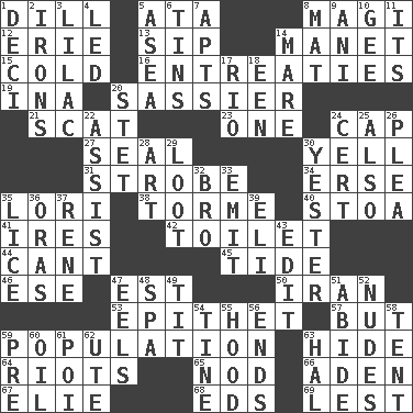ACROSS 1. Deli pickle 5. _ moment's notice (2 wds.) 8. Wise men 12. One of the Great Lakes 13. Small drink 14. French painter Edouard 15. Lacking warmth 16. Pleas 19. _ tizzy (2 wds.) 20. More disrespectful 21. Jazz singing style 23. Single 24. Head covering 27. Lick closed 30. Shout 31. Disco prop 34. Celtic language 35. Australian parrot (variant) 38. Singer Mel 40. Portico 41. Angers 42. Bathroom plumbing fixture 44. Patter 45. Event that recurs at intervals 46. Compass dir. 47. Eastern Standard Time (abbr.) 50. SW Asia republic 53. Curse 57. With the exception that 59. Census information 63. Flintstone garb 64. Debaucheries 65. Dreamland 66. Arabian gulf 67. Writer Wiesel 68. Begley and Asner 69. For fear that DOWN 1. Tenth: prefix 2. Removes the wrinkles 3. Pale purple color 4. Directed 5. Toward the sea 6. Metal containers 7. Tenement units (abbr.) 8. Floor covering 9. Black tropical American cuckoo 10. Turn to the right 11. It is 14. Female horse 17. _ de Janeiro 18. Car or cant ending 20. Proofreading order 22. Aid 24. Foregone conclusion 25. In addition 26. Entreaty 28. Nonscientific branch of learning 29. Spoils 30. Next before 32. Sis' sibling 33. Send forth 35. Louse (plural) 36. Mouths or openings 37. French philosopher Descartes 39. Connecticut Ivy Leaguer 43. Prepare for publication 47. Snakelike fish 48. Health resort 49. Teat (slang) 51. Stay 52. Unadorned figures 54. Prong on a fork 55. Parka part 56. Extremities 58. Portable shelter 59. Before (prefix) 60. Petroleum 61. Luau course 62. Shoshoni 63. Actor Linden