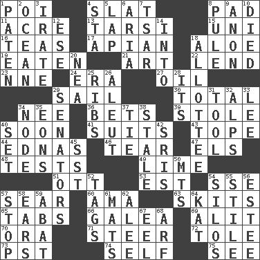 ACROSS 1. Luau course 4. Narrow board 8. Writing tablet 11. Land measure 13. Tarsus (plural) 15. Corn or form start 16. Afternoon social gatherings 17. Bee-related 18. _ vera 19. Ingested 21. Tate display 22. Grant temporary use of 23. Compass dir. 24. Epoch 27. Lubricate 29. Travel by water 30. "_____ Recall" 34. Born 36. Wagers 39. Fur scarf 40. Within a short period 41. Sets or collections 43. Drink excessively 44. Ferber et al. 46. Lacerate 47. Raised railways 48. Trials 49. Citrus frut 51. Baseball player Mel 53. Eastern Standard Time (abbr.) 54. Compass dir. 57. Shrivel 60. Nursemaid (var.) 63. Burlesque acts 65. Bar bills 66. An organ shaped like a helmet 69. Came down and settled, as after flight 70. Mouth or opening 71. Navigate 72. Lacquered or enameled metalware 73. Pacific Standard Time (abbr.) 74. Automatically 75. Observe DOWN 1. Eucharist need 2. Sea 3. Feeling or showing extreme anger 4. R.R. building 5. Infant locale 6. Roberta Peters solo 7. Russian ruler of old 8. Whine 9. At once, immediately (arch.) 10. Passed on 12. Compass dir. 14. To the inside or interior of 18. One to whom something is allotted 20. Teachers' org. 25. Teases 26. Native American of Southwest Alaska 28. It is 29. Legislators 31. Utensil 32. High mountains 33. Area sheltered from the wind 34. Connecting point 35. Immeasurably long periods of time 37. Neckwear 38. Having lost freshness 40. Put into a specified state 42. Indian titles of respect 45. Fast jet (abbr.) 50. Mountains (abbr.) 52. Labels 54. Grain storage towers 55. Vertical member of a panel or frame 56. First name in cosmetics 57. Constrict 58. Hearing organs 59. Blind as ____ 61. Floor coverings 62. Toward shelter 64. Krazy ___ of comics 67. Snakelike fish 68. Sandy's bark