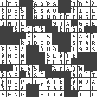 ACROSS 1. French article 4. Republicans 8. The main thing one is thinking about 12. Lyric poems 14. Son of Isaac 15. Deli pickle 16. Tenth: prefix 17. Unrelated to defense, as in spending 20. International (abbr.) 21. R.R. building 22. Turn to the right 23. Makes a sale 27. Baby bed with high sides 29. Snakelike fish 31. Indian skirt 34. Cowboy competition 35. Play the lead 36. Dad 39. Superhero pair 41. United States Postal Service (abbr.) 42. Soon (poet.) 43. Chalkboard 46. Diluted with white 47. Writer Wiesel 48. Afternoon social gatherings 51. At full speed 54. Slender fish 56. Science/research agcy. 58. Electrical Unit 61. Conciliate 66. Small Philippine buffalo 67. Portico 68. One who doesn't tell the truth 69. 1994 drama film starring Jodie Foster 70. Transmit 71. Singer James 72. Affectionate concern, for short DOWN 1. Farming town in central California 2. Locale of original sin 3. Religious groups 4. Commissioned military rank (abbr.) 5. Bear (Spanish) 6. Baking dish 7. Beer foam 8. Binary compound 9. Empty-headed or silly people 10. Otherwise 11. Toward shelter 13. Drop; flow; fall 18. And so on (abbr.) 19. At a great distance 24. Lion 25. Directed 26. Downhill vehicle 28. Come out of 30. Boozer 32. Reproach for some lapse or misdeed 33. Big collection agency 34. The wife of a rajah (variant) 36. Infant food 37. Santa ___, CA 38. Characterized by complete cowardliness 40. Rounded earthenware pot or jar 44. Direct toward a target or goal 45. Beverage made from leaves 49. Black tropical American cuckoo 50. Fast jet (abbr.) 52. _ the terrible 53. Music written for nine 54. Global Positioning Systems (abbr.) 55. Johnson of "Laugh-In" 57. Do some clerical work 59. Hang loosely or laxly 60. Baby powder 62. Groovy apt. 63. Small island 64. Make lace 65. Period