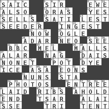 ACROSS 1. Ketch in the Levant 5. Title for a knight 8. She-sheep 11. In addition 12. Mouths or openings 14. Affirmative reply 15. Exchanges for money 17. Suttee (variant) 18. For fear that 19. Sowing specialist 21. Eat 23. At this time 25. Stare 26. The sixth month of the Jewish calendar 27. Modern: prefix 28. Perceive with the eye 31. English channel? 33. Cartoonist voice _ Blanc 35. Shopping centers 37. Having or resembling wings 38. Tired old horse 40. Raised platform 41. Music written for nine 43. Plant holder 45. Color 46. Frozen water 47. White ___ sheet 50. Immeasurably long periods of time 52. Religious women 53. R.R. building 54. Pictures 56. Main course 61. Put down 62. Chest bones 65. Hold, grip (Informal) 66. Conclusion 67. Russian ruler of old 68. Jai _ 69. Compass dir. 70. Three (prefix) 71. Portable shelter DOWN 1. Backtalk 2. Toward shelter 3. Capri or Wight 4. Having a low temperature 5. Mayday 6. Lyricist Gershwin 7. Food allowance for one day 8. Snake ____ (dice throw) 9. Compass direction 10. Eastern Standard Time (abbr.) 13. Burn superficially 16. Post 18. Area sheltered from the wind 20. Wander 22. Seize upon or latch onto something 24. Songbird 26. Measure of real estate 28. Kill 29. Writer Wiesel 30. Double-curved letter 31. Alliance 32. Object of repulsion 34. Pet locale 36. Sums up 37. Cuckoo 39. Moves 42. Tense 44. Carryall 48. Derisive sound 49. Help 51. Grandmother 52. Dreamland 54. Baking dishes 55. Flintstone garb 57. Not this but _ 58. Hero or heavy, e.g. 59. Flair 60. Prepare for publication 61. French article 63. Tavern 64. _ Lanka