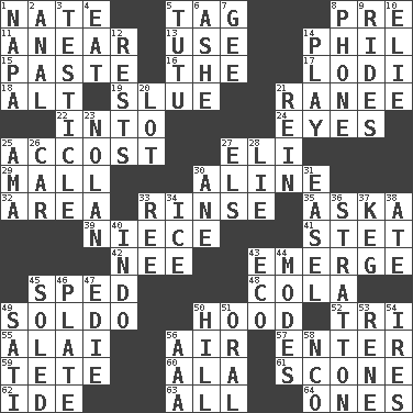 ACROSS 1. Nathan's nickname 5. Label 8. Before (prefix) 11. Approach 13. Purpose 14. Silvers or Donahue 15. Thick mixture 16. Definite Article 17. Farming town in central California 18. The first octave above the treble staff 19. Turn sharply 21. Indian princess (variant) 22. To the inside or interior of 24. Sight organs 25. Buttonhole 27. Connecticut Ivy Leaguer 29. Shopping center 30. Place in a line 32. Type of rug 33. Wash lightly 35. "____ silly question..." 39. Sibling's daughter 41. Proofreading order 42. Born 43. Develop 45. Drove too fast 48. Root beer relative 49. Twentieth part of a lira 50. Parka part 52. Three (prefix) 55. Mountain range southwest of Kyrgyzstan 56. Wind 57. Keyboard key 59. False hair 60. Chicken ___ king 61. Biscuitlike quick bread 62. Binary compound 63. Everything 64. Washington bills DOWN 1. California wine valley 2. Of or related to the anus 3. A testis 4. Ingest 5. Ballerina skirt 6. American tennis player Robert 7. Unit of force equal to gravity 8. Give a jingle 9. Amusement-park features 10. Writer Wiesel 12. Musical pauses 14. Shaw product 20. Car dealer's back yard 21. It's straight from the horse's mouth 23. Pitcher Ryan 25. Wet nurse (var.) 26. Automobile 27. Raised railways 28. Untruth 30. A saturated hydrocarbon 31. Artist's stand 33. To separate or throw off 34. Frozen water 36. Ski resort town in Vermont 37. Cask 38. Had dinner 40. Southeast Asian peninsula 43. Environmental prefix 44. Methods 45. Having a sole or soles 46. Food holder 47. Singer Brickell 49. Suttee (variant) 50. Land elevation 51. Spoken 53. French philosopher Descartes 54. Angers 56. American Automobile Association (abbr.) 58. Non-commissioned officer (abbr.)
