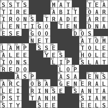 ACROSS 1. Fast planes 5. Floor protector 8. Beverage made from leaves 11. Hoop that covers a wheel 12. "This won't hurt ____!" 14. Boat paddle 15. Removes the wrinkles 17. Buy and sell 18. "We ___ not amused" (Victoria) 19. Small, flat, pigmented spot on the skin 21. "___ Little Indians" 22. Heredity factor (abbr.) 23. Compass dir. 24. Thick or sticky substance 25. Two (Sp.) 27. Fish or hair follower 28. Smallest unit of an element 31. Desk light 35. Compass dir. 37. Lacquered or enameled metalware 38. Toward shelter 39. Affirmative reply 41. Opening into or through something 42. Charged particles 43. Mouth edge 45. Narrow board 46. Make new 47. Trim (branches) 49. Viper 51. White ___ sheet 52. Followers of ems 55. Curve 57. Chief or king in Benin or Nigeria 60. Commissioned military rank 62. Luau accessory 63. Wash lightly 65. Before Barbara or Clara 66. Pacific Standard Time (abbr.) 67. Hyperbolic tangent 68. Thailand, formerly 69. Filthy place 70. Perceive with the eye 71. Snakelike fish DOWN 1. Vertical member of a panel or frame 2. Titles for men of rank and authority 3. Heavy duty weighing machine 4. Posted 5. Third mo. 6. Blind as ____ 7. Periodic rise and fall of the sea level 8. Inedible or poisonous agaric 9. Merit 10. Length times width 13. Look after 16. Signal 17. A girl or young woman (variant) 20. Leaves 26. Curses 29. Rounded earthenware pot or jar 30. Rendezvous 31. Den 32. _ vera 33. Ananias' fault 34. Mexican monetary units 36. Snakelike fish 40. Fodder prepared in a silo 44. Introduce or present, as a question 48. Baking dishes 50. Sweet dark-red dessert wine 52. Bert's buddy 53. Brizilian seaport 54. Hits or strikes with great force 55. High mountains 56. Remainder 58. Prejudice 59. Queen of England 1702-14 61. Relaxation 64. A female animal or person