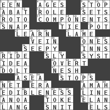 ACROSS 1. Car or cant ending 4. Eons 8. Halt 12. Blind as ____ 14. Hero or heavy, e.g. 15. Puts into a specified state 16. Printing process, for short 17. Parts 20. Fastener 21. Standoff 22. Plant holder 23. Acquire or gain knowledge or skills 27. Unable to walk 29. Distinctive style or manner 31. Washington bills 34. Not well drained, as in land 35. Restaurants 36. Travel on an animal 39. Wily 41. System (abbr.) 42. The main thing one is thinking about 43. Unconcealed 46. Stupid person 47. Tender 48. Toward the sea 51. Ceases 54. Fish or hair follower 56. Epoch 58. Nursemaid 61. The property of being fit to eat 66. Actor's bit 67. Small Philippine buffalo 68. Casino tip 69. Flair 70. Austrian-born American filmmaker Fritz 71. In a ____ (agitated or irritated) 72. Raised railways DOWN 1. Hearing organs 2. Inky black, to poets 3. Relating to or accompanying birth 4. Curve 5. Thick or sticky substance 6. Shade tree 7. Back-to-school mo. 8. Compass dir. 9. 3-inch nail 10. Von Bismarck 11. Inconspicuous attention getter 13. Drink excessively 18. Petroleum 19. Teachers' org. 24. "___ Maria" 25. To sift 26. Pinches, bites 28. Damp 30. High-strength synthetic material 32. Followers of ems 33. Fast jet (abbr.) 34. Theater features 36. To free from 37. Wedding promise 38. Accusation by an informer 40. Jacques Cousteau's middle name 44. Eastern Standard Time (abbr.) 45. 17th letter of the Greek alphabet 49. Snakelike fish 50. "We ___ not amused" (Victoria) 52. Light colored 53. Grin 54. Be tempered by heat 55. Pulitzer Prize-winning author Ferber 57. Pismires 59. Of or related to the anus 60. Coop moms 62. Paper or plastic container 63. Period of immesurable duration 64. What Jean-Claude Killy likes to do 65. Arrange properly for use