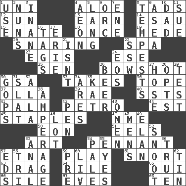 ACROSS 1. University (slang) 4. _ vera 8. Small boys 12. Player for Phoenix 13. Merit 14. He sold his birthright 15. Related on the mother's side 18. Single time 19. Ancient Persian 20. Catching in a trap 22. Health resort 23. The front part of a cuirass 24. Compass dir. 25. Elected rep. 26. The distance a bow sends an arrow 30. Girls' org. (abbr.) 33. Proceeds 36. Drink excessively 37. Rounded earthenware pot or jar 39. Actress Charlotte 40. Fast planes 41. Inside of hand 42. Stone: prefix 44. Eastern Standard Time (abbr.) 45. Paper fasteners 47. Madame (abbr.) 50. Period of immesurable duration 51. Snakelike fish 53. Tate display 54. Pre-World Series prize 57. Inactive volcano in Sicily 59. Shaw product 61. Derisive sound 63. To trail on the ground 64. Cause heat under the collar 65. Fr. "Yes" 66. Drop; flow; fall 67. Nights before holidays 68. Nine, plus one DOWN 1. Purpose 2. Religious women 3. Lacking in sense or substance 4. Period of immesurable duration 5. Austrian-born American filmmaker Fritz 6. The grampus (Milton) 7. Compass dir. 8. Storms 9. Toward the sea 10. Male parent 11. Institute legal proceedings 16. Labels 17. 4th largest of the Great Lakes 21. Is not 22. Compass dir. 24. Greek goddess of the dawn 26. Fermented drink made from hops 27. Flexible conduit 28. Chooses 29. Trial 30. Republicans 31. Narrow board 32. Silent film actress Nazimova 34. Ancient Greek god of war 35. Krazy ___ of comics 38. Electrical Measurement 42. Writing instrument 43. Sign of something about to happen 46. Car dealer's back yard 48. Not women's 49. Enthusiasm 52. Snob 53. Of or related to the anus 54. Light colored 55. Snake ____ (dice throw) 56. Loyal 57. Begley and Asner 58. Three (prefix) 59. Before (prefix) 60. 54 in ancient Rome 62. Metal container