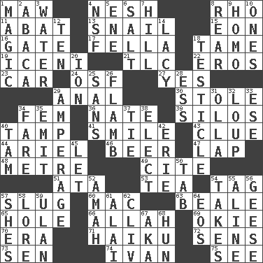 ACROSS 1. Informal term for the mouth 4. Delicate 8. 17th letter of the Greek alphabet 11. Blind as ____ 13. Slow-paced one 15. Period of immesurable duration 16. Yard entry 17. Chap (slang) 18. Docile 19. Ancient Celtic tribe of eastern Britain 21. Affectionate concern, for short 22. Greek god of love 23. 4-wheeled motor vehicle 24. Order of Saint Francis (abbr.) 27. Consenting reply 29. Of or related to the anus 30. Took without asking 34. Opposite of masc. 36. Nathan's nickname 39. Grain storage towers 40. Pack (down) 41. Grin 43. A slight indication 44. Satellite of Uranus 46. Fermented drink made from hops 47. Infant locale 48. Distance measurement (Brit.) 49. Quote 51. _ moment's notice (2 wds.) 53. Beverage made from leaves 54. Label 57. Strike heavily 60. Big _ 63. Calif. Air Force Base 65. Hollow 66. Assad's deity 69. Migrant worker of the '30s 70. Period 71. Japanese verse 72. Elected reps. 73. Elected rep. 74. "Terrible" tsar 75. Perceive with the eye DOWN 1. Mysterious quality of enchantment 2. Phillipine bananalike plant 3. Wetness 4. Overdraft (abbr.) 5. Compass dir. 6. Table seasoning 7. Land elevation 8. Tail end 9. Like (prefix) 10. Singles 12. "___ Little Indians" 14. Made of lace 18. One of the two male reproductive glands 20. Electrically charged atom 25. Without 26. Flambe (short form) 28. Double-curved letter 29. Electrical Measurement 31. Spanish pot 32. Central Nebraska county 33. Compass dir. 34. Conductor's collection 35. Give off 37. Neckwear 38. Choose 40. Scottish cap 42. 4th largest of the Great Lakes 45. Allow 50. Keyboard key 52. Housemaid 54. Receives possession of 55. Place in a line 56. Honkers 57. "______ My Girl" (Turtles hit) 58. Old wives' tales, e.g. 59. ____ Bator 61. Mountain range southwest of Kyrgyzstan 62. 154 in Roman numerals 64. Greek goddess of the dawn 67. Alias (abbr.) 68. Attila the _
