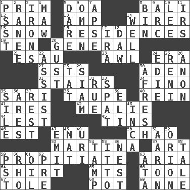 ACROSS 1. Demure 5. ___ good deed 8. Indonesian resort city 12. "Two Mules for Sister ____" 13. Electrical Unit 14. One who wires 15. Frozen precipitation 16. Dwellings 19. Nine, plus one 20. Commissioned military rank 21. He sold his birthright 23. Leather borer 24. Epoch 27. Fast planes 30. An important port of Yemen 31. Flight of steps 34. A pale, very dry sherry 35. Indian skirt 38. Grayish beige 40. It's straight from the horse's mouth 41. Angers 42. Ear of corn 44. For fear that 45. Airtight sealed metal containers 46. Eastern Standard Time (abbr.) 47. Australian flightless bird 50. US Secretary of Labor Elaine L. _ 53. Chrissie's court nemesis 57. Tate display 59. Appease 63. Roberta Peters solo 64. Chest covering 65. Mountains (abbr.) 66. Utensil 67. Lacquered or enameled metalware 68. Cooking vessel 69. Queen of England 1702-14 DOWN 1. Inconspicuous attention getter 2. The wife of a rajah (variant) 3. Removes the wrinkles 4. Informal term for the mouth 5. Have the gumption 6. Sign of things to come 7. Domed church section 8. Storage container 9. Curve 10. Area sheltered from the wind 11. Big collection agency 14. Water source 17. Retirement account (abbr.) 18. Obsolete 20. Abrupt rush of wind 22. Aid 24. Singer Brickell 25. Painter Guido (1575-1642) 26. At once, immediately (arch.) 28. Make lace 29. Thailand, formerly 30. Anew 32. Sorrow 33. Argument over a trivial matter 35. Filth; sediment 36. Ancient Greek god of war 37. Relief 39. Biblical high priest 43. South American Indian 47. Send forth 48. Floor covering 49. RI univ. 51. Composer Copland 52. Greek mythologigal hunter 54. Pack (down) 55. "Tell ____ the Marines!" 56. A home for chicks 58. Lie 59. Pacific Standard Time (abbr.) 60. 17th letter of the Greek alphabet 61. Lubricate 62. Before (prefix) 63. _ moment's notice (2 wds.)
