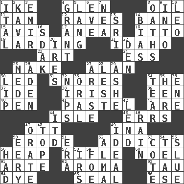 ACROSS 1. Mamie's husband 4. Small, secluded valley 8. Lubricate 11. Scottish cap 12. All-night dance parties 14. Object of repulsion 15. Advice 17. Approach 18. "Tell ____ the Marines!" 19. Preparing or cooking with lard 21. Potato state 23. Tate display 24. Curvy letter 25. Cause to be 27. ____ Jay Lerner 30. Directed 31. Sounds asleep 34. Definite Article 37. Binary compound 38. From or relating to Ireland 39. Car or cant ending 40. Writing instrument 41. Soft color 43. "We ___ not amused" (Victoria) 44. Small island 45. Blunders 47. Baseball player Mel 49. _ tizzy (2 wds.) 50. Wear away 52. Inveterate users 56. Pile 57. Ransack; plunder; pillage 60. Christmas carol 61. Johnson of "Laugh-In" 62. Odor 63. The 19th letter of the Greek alphabet 64. Color 65. Lick closed 66. Compass dir. DOWN 1. Slanted text style (abbr.) 2. Polynesian shrub of the pepper family 3. Independent ruler or chieftain 4. Monetary aid 5. Austrian-born American filmmaker Fritz 6. First lady 7. Teachers' org. 8. Curses 9. To the inside or interior of 10. Lion 13. Indian title of respect (Mr.) 14. Prejudice 16. Neighbor of Neb. 20. Angers 22. Lair 25. Ancient Persian 26. Arabian gulf 27. Originate 28. For fear that 29. American tennis player Robert 30. Mouth edge 32. Pinches, bites 33. Taken by mouth 34. Separate forcefully 35. Possessive pronoun 36. Compass dir. 42. Grant temporary use of 44. It would 46. Precipitation 47. Declaim 48. Drink excessively 49. Perfect 50. Suggestive of the supernatural 51. Epoch 52. _ mater 53. ____ d'Azur (French Riviera) 54. Beverages made from leaves 55. Change direction abruptly 56. Possessed 58. Big collection agency 59. Enemy