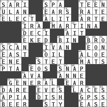 ACROSS 1. Indian skirt 5. Health resort 8. Adolescent 12. Uhlan (variant) 13. Hearing organs 15. Pace 16. Voters do this 18. Set down 19. Johnson of "Laugh-In" 20. Lyricist Gershwin 22. Chrissie's court nemesis 24. Tenth: prefix 26. Small island 27. Made supply last 28. Storage container 29. Sis' sibling 32. Examine hastily 35. "Terrible" tsar 37. A really long time 38. Compass direction 39. Lubricate 40. _ vera 41. Compass dir. 42. Proofreading order 43. Floor coverings 44. Parent Teacher Assoc. 45. Greek goddess of the dawn 46. Fastener 49. Actress Gardner 50. Singer Murray 51. Commissioned military rank 55. Hearing organ 56. Have the gumption 57. Nights before holidays 59. Shoestrings 63. Capital of Western Samoa 64. Food container 65. Global Positioning Systems (abbr.) 66. Fermented drink made from hops 67. Filthy place 68. Relaxation DOWN 1. Institute legal proceedings 2. 100% 3. Actress Charlotte 4. Happening 5. Ocean 6. Inside of hand 7. Roberta Peters solo 8. Distinguishing feature 9. Merit 10. Singer James 11. Born 14. Put through a sieve 17. Long journey 21. Adept person 23. Shallow baking pan 25. Foolish or stupid persons 28. Greek mezzo-soprano Agnes 29. Actor Lugosi 30. Carrot, for example 31. Singles 32. Ooze 33. Patter 34. Toward the sea 36. Compete 40. Electrical Measurement 42. Flew 45. Night before a holiday 47. Compass dir. 48. Of or related to the anus 49. Approach 51. Stare wonderingly 52. One of the Great Lakes 53. Advice 54. For fear that 56. Pat or tap gently 58. Like a shrinking violet 60. Tax preparer (abbr.) 61. Double-curved letter 62. Compass dir.