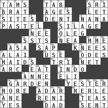 ACROSS 1. Scottish caps 5. Bar bill 8. _ Lanka 11. Naughty child 12. Ripens 14. Allow 15. Locates 17. Gouge 18. Grandmother 19. Soft color 21. Fodder prepared in a silo 23. Born 25. Cassini of fashion 26. Fast planes 27. Teachers' org. 28. Madame (abbr.) 31. White ___ sheet 33. Plant excrement 35. Leg joints 37. Mountain range southwest of Kyrgyzstan 38. Purpose 40. Lyric poems 41. Women servants 43. Three (prefix) 45. Fish or hair follower 46. Curve 47. Erode 50. _ china 52. Singer Murray 53. Connecticut Ivy Leaguer 54. Place where plants grow 56. Last past 61. Greater amount 62. The sixth month of the Jewish calendar 65. Haggard of country music 66. One (Scot) 67. Painter Guido (1575-1642) 68. Afternoon social gatherings 69. Affirmative reply 70. Male parent 71. Transmitted DOWN 1. Cook's measure (abbr.) 2. Roberta Peters solo 3. Floor coverings 4. Proofreading order 5. Bit 6. Personal question 7. Gillaume's butler role 8. Volcanic refuse 9. French philosopher Descartes 10. Call ___ day 13. Vertical member of a panel or frame 16. Elected reps. 18. Tired old horse 20. Allows 22. Path through which fluid escapes 24. Son of Isaac 26. Stated 28. Ancient Persian 29. Confront 30. Double-curved letter 31. Having or resembling wings 32. Ketch in the Levant 34. Pacific Standard Time (abbr.) 36. Words to Nanette 37. Nursemaid (var.) 39. One of the Great Lakes 42. Transmit 44. In an inward manner 48. Approach 49. Looked after 51. South Vietnam president (1954) 52. "We ___ not amused" (Victoria) 54. Went 55. Ancient Greek god of war 57. Arranges properly for use 58. Relationship diagram 59. Liveliness 60. Take ten 61. Fifth month 63. Santa ___, CA 64. To free from