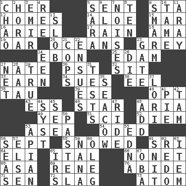 ACROSS 1. "Mermaids" star 5. Posted 9. R.R. building 12. Residences 14. Medicinal plant 15. Spoil 16. Satellite of Uranus 17. Precipitation 18. Wet nurse (var.) 19. Boat paddle 20. Seas 23. Jennifer or Joel 24. Inky black, to poets 25. Dutch treat 27. Nathan's nickname 30. Pacific Standard Time (abbr.) 32. Be seated 33. Merit 34. Institutes legal proceedings 36. Snakelike fish 38. The 19th letter of the Greek alphabet 39. Compass dir. 40. Choose 43. Curvy letter 46. Play the lead 48. Roberta Peters solo 49. Slangy assent 51. _-fi 52. South Vietnam president (1954) 53. Toward the sea 54. Wrote a lyric poem 56. Back-to-school mo. 58. Overwhelmed 61. Indian title of respect (Mr.) 64. Connecticut Ivy Leaguer 65. Slanted text style (abbr.) 66. Music written for nine 68. White ___ sheet 69. French philosopher Descartes 70. Remain 71. Elected rep. 72. Volcanic refuse 73. Smallest unit of an element DOWN 1. US Secretary of Labor Elaine L. _ 2. Israeli folk dance 3. Independent ruler or chieftain 4. Portuguese money of account (variant) 5. "Two Mules for Sister ____" 6. Flair 7. Annoying sounds 8. "___ Little Indians" 9. Excessive but superficial compliments 10. Not wild 11. Like ___ of sunshine 13. Messy guy 21. 911 reaches them 22. Follows as a consequence or result 23. Yard entry 24. Car or cant ending 26. Expire 27. Fish or hair follower 28. American Automobile Association (abbr.) 29. Loyal 31. Trials 35. Manatee 37. Australian parrot (variant) 41. Sliced dessert 42. Scottish cap 44. System (abbr.) 45. Observe 47. Travel on an animal 48. Find the sum of 50. Soft color 53. Bee-related 55. Pulitzer Prize-winning author Ferber 56. Oceans 57. Otherwise 59. Nanny 60. Cassini of fashion 61. In a ____ (agitated or irritated) 62. Do over again 63. A distinct part 65. Big collection agency 67. Chief or king in Benin or Nigeria