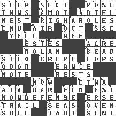 ACROSS 1. Ooze 5. Religious group 9. Introduce or present, as a question 13. Lodging establishments 14. Mine, in Marseilles 15. Satellite of Uranus 16. A home for chicks 17. Frustrating wastes of time 19. Australian flightless bird 20. Wind 21. Sep. follower 22. Compass dir. 23. Shout 25. To riddle 26. _____ Park, CO 30. Land measure 34. Pitcher Ryan 35. Necklace unit 36. Grain storage tower 39. Streamer paper 42. Chops off 43. Scent 44. Bert's buddy 46. Short letter 47. Musical pauses 48. At this time 51. Inactive volcano in Sicily 54. _ moment's notice (2 wds.) 57. Boat paddle 58. Shade tree 60. Eastern Standard Time (abbr.) 62. Unrelated to defense, as in spending 65. Celtic language 66. Get behind 67. Oceans 68. Baking chamber 69. Flatfish 70. Pulled tight 71. Emitted DOWN 1. Trig term 2. Foe 3. Follow as a consequence or result 4. Pacific Standard Time (abbr.) 5. Indian skirt 6. Arab leader 7. Gear tooth 8. Southeast Indonesia island 9. Adept person 10. Petroleums 11. Perceives with the eye 12. Otherwise 15. Johnson of "Laugh-In" 18. Adept person 20. In addition 24. Poe poem 27. Affectionate concern, for short 28. Ewer handle 29. Contemptuous expression 30. Most capable 31. Corporate head (abbr.) 32. Reproach for some lapse or misdeed 33. Begley and Asner 36. Male offspring 37. Wedding promise 38. Car dealer's back yard 40. Before (prefix) 41. Followers of ems 45. Detail 48. Christmas carol 49. Clumsy lout 50. Take or capture by force 52. Effrontery 53. NE Netherlands city 54. Pismires 55. "Corrida" creature 56. Of or related to the anus 58. Son of Isaac 59. For fear that 61. Portable shelter 63. Pass on 64. Teachers' org. 65. Greek goddess of the dawn