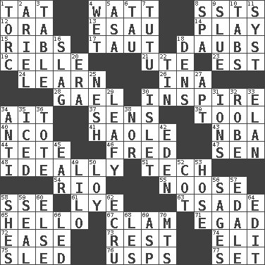 ACROSS 1. Make lace 4. Electrical Unit 8. Fast planes 12. Mouth or opening 13. He sold his birthright 14. Romp 15. Teases 17. Pulled tight 18. Applies to a surface 19. Cell (Danish) 21. Shoshoni 23. Eastern Standard Time (abbr.) 24. Acquire or gain knowledge or skills 26. _ tizzy (2 wds.) 28. Highlander 30. Heighten or intensify 34. Small island 37. Elected reps. 39. Instrument 40. Non-commissioned officer (abbr.) 41. White Person, in Hawaii 43. Basketball assoc. 44. False hair 46. Flintstone 47. Elected rep. 48. Under perfect conditions 51. Technology 54. River (Sp.) 55. Trap for birds or small mammals 58. Compass dir. 61. Potassium hydroxide 63. Sadhe (variant) 65. Phone greeting 67. Burrowing marine mollusk 71. Mild oath 72. Relaxation 73. Repose 74. Connecticut Ivy Leaguer 75. Downhill vehicle 76. United States Postal Service (abbr.) 77. Put into a specified state DOWN 1. Torque (variant) 2. Satellite of Uranus 3. Eating place 4. Soggy 5. White ___ sheet 6. The 19th letter of the Greek alphabet 7. Ballerina skirt 8. Health resort 9. Turn sharply 10. Bar bills 11. System (abbr.) 16. Volcanic refuse 18. Lairs 20. Epoch 22. Metal container 25. Tender 27. Fitting 29. Like summer trees 30. Small island 31. Charged particles 32. Loose flowing garment 33. Enthusiasm 34. Against 35. On the rocks 36. Carryall 38. Not either 42. Genesis locale 45. Hearing organ 49. _ and Stitch 50. Myrna of the movies 52. Small bed 53. Flexible conduit 56. Gurus 57. Peak District village in England 58. "______ My Girl" (Turtles hit) 59. Lick closed 60. Otherwise 62. Shade of tan 64. Prepare for publication 66. Directed 68. French article 69. Viper 70. Mountains (abbr.)