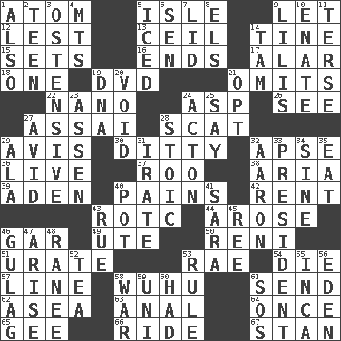 ACROSS 1. Tiny particle 5. Small island 9. Allow 12. For fear that 13. To provide with a ceiling 14. Prong on a fork 15. Arranges properly for use 16. Extremities 17. Having or resembling wings 18. Single 19. Movie disc 21. Leaves out 22. Billionth: prefix 24. Viper 26. Observe 27. Slender Brazilian palm 28. Get outta here! 29. Opinion 30. Simple song 32. Domed church section 36. Moving, as bait 37. Friend of Pooh 38. Roberta Peters solo 39. An important port of Yemen 40. Aches 42. Monthly bill 43. College mil. group 44. Came up 46. Slender fish 49. Shoshoni 50. Painter Guido (1575-1642) 51. A salt of uric acid 53. Actress Charlotte 54. Pass on 57. Actor's bit 58. Chinese city south-southwest of Nanjing 61. Post 62. At sea 63. Of or related to the anus 64. Single time 65. Unit of force equal to gravity 66. Travel on an animal 67. Comedian Laurel of Laurel & Hardy DOWN 1. In addition 2. Adolescent 3. Clearly or manifestly demonstrative 4. Mountains (abbr.) 5. On the rocks 6. Elected rep. 7. Flaplike covering 8. Raised railways 9. Ms. Damita and namesakes 10. Related on the mother's side 11. Laconic 14. Scottish cap 19. Heredity factor (abbr.) 20. Empty area or space 21. Elect 23. NE Netherlands city 24. NE Massachussets city 25. Declare 27. Enthusiastic 28. Unemotional 29. Chicken ___ king 31. Feeling or showing extreme anger 32. Composer Copland 33. Elected leader of a country 34. Trig term 35. Consume 40. Cooking vessel 41. "Two Mules for Sister ____" 43. Sorrow 45. To sift 46. POW camp 47. Ascend 48. The wife of a rajah (variant) 52. Afternoon social gathering 53. Court order 55. South American Indian 56. Genesis locale 58. Armed conflict 59. Single; one (prefix) 60. Possessed 61. Mayday