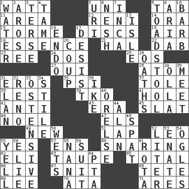 ACROSS 1. Electrical Unit 5. University (slang) 8. Keyboard key 11. Length times width 12. Painter Guido (1575-1642) 14. Mouth or opening 15. Singer Mel 17. Plates 18. Wind 19. Gist 21. Actor Linden 22. Small moist lump or mass 23. Portuguese money of account (variant) 24. Two (Sp.) 25. Greek goddess of the dawn 27. Fr. "Yes" 28. Smallest unit of an element 31. Greek god of love 35. 23rd letter of the Greek alphabet 37. Lacquered or enameled metalware 38. For fear that 39. Ring climax 41. Hollow 42. Opposed to 43. Epoch 45. Narrow board 46. Christmas carol 47. Raised railways 49. ___ Haven, CT 51. Infant locale 52. Lion 55. Consenting reply 57. Followers of ems 60. Catching in a trap 62. Biblical high priest 63. Grayish beige 65. "_____ Recall" 66. 54 in ancient Rome 67. In a ____ (agitated or irritated) 68. Wig 69. Area sheltered from the wind 70. "One Day ___ Time" 71. Ancient Greek god of war DOWN 1. Wetness 2. Came up 3. Laconic 4. Not wild 5. RI univ. 6. Delicate 7. South American Indian 8. Inedible or poisonous agaric 9. Operatic vocal solo 10. Sharp remark 13. Capri or Wight 16. Inside; within (prefix) 17. Stop 20. Overturn; upset 26. Expletives 29. Rounded earthenware pot or jar 30. Confront 31. Flair 32. Former U.S. Attorney General Janet 33. Clearly or manifestly demonstrative 34. Vertical member of a panel or frame 36. D.D.E's nickname 40. Threatening words 44. Actor Alda or Thicke 48. Argument over a trivial matter 50. Soaks 52. 61 cubic inches 53. Maternal 54. Stares 55. Shout 56. Writer Wiesel 58. Nanny 59. Set or collection 61. Round or rotation of duties 64. Parent Teacher Assoc.