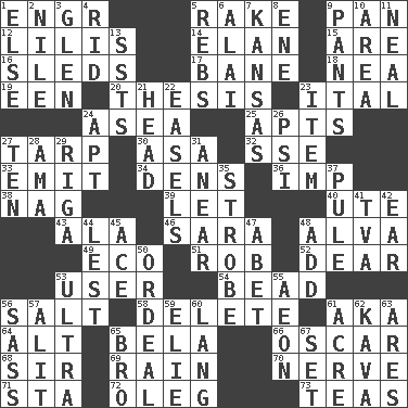 ACROSS 1. Engineer (abbr.) 5. Libertine 9. Baking dish 12. Ms. Damita and namesakes 14. Style 15. "We ___ not amused" (Victoria) 16. Bobsleighs 17. Object of repulsion 18. Teachers' org. 19. Car or cant ending 20. College paper 23. Slanted text style (abbr.) 24. Toward the sea 25. Tenement units (abbr.) 27. Canvas cover 30. White ___ sheet 32. Compass dir. 33. Send forth 34. Lairs 36. Mischievous child 38. Tired old horse 39. Allow 40. Shoshoni 43. According to 46. "Two Mules for Sister ____" 48. Inventor's middle name 49. Environmental prefix 51. Director Reiner 52. Letter starter 53. One who uses or employs something 54. Necklace unit 56. Table seasoning 58. Erase 61. Alias (abbr.) 64. Keyboard modifier key 65. Actor Lugosi 66. Witty Wilde 68. Title for a knight 69. Water falling in drops from the sky 70. Impudent aggressiveness 71. R.R. building 72. Cassini of fashion 73. Beverages made from leaves DOWN 1. Otherwise 2. "Death on the ____" 3. Small, secluded valley 4. To free from 5. Confederate soldiers (slang) 6. Mountain range southwest of Kyrgyzstan 7. Sunflower state 8. Compass dir. 9. Leg coverings 10. Type of rug 11. Actress Patricia 13. Fast planes 21. Froth on beer 22. Artist's stands 23. A distinct part 24. Fitting 26. Air pressure measure (abbr.) 27. "___ Little Indians" 28. Nanny (var.) 29. Port city in Latvia 31. Approach 35. Disco prop 37. Whimper 41. Federal power corp. 42. Hearing organ 44. For fear that 45. Adept person 47. Collude with 48. Increase 50. Severe or trying experience 53. Extremist 55. A really long time 56. Backtalk 57. Came down and settled, as after flight 59. Writer Wiesel 60. Austrian-born American filmmaker Fritz 61. Land measure 62. Polynesian shrub of the pepper family 63. Ancient Greek god of war 65. Sis' sibling 67. Put into a specified state