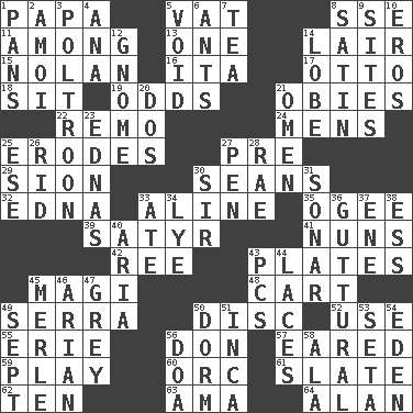 ACROSS 1. Dad 5. Large container 8. Compass dir. 11. Amid 13. Single 14. Den 15. Pitcher Ryan 16. Call ___ day 17. "Beetle Bailey" pooch 18. Be seated 19. Likelihood 21. Off-Broadway awards 22. San ____ (Riviera town) 24. Not women's 25. Eats (away) 27. Before (prefix) 29. The Jewish people; Israel 30. Seines 32. Pulitzer Prize-winning author Ferber 33. Place in a line 35. Double curve, resembling the letter S 39. Man with strong sexual desires 41. Religious women 42. Portuguese money of account (variant) 43. Food holders 45. Wise men 48. Draw slowly or heavily 49. Spanish missionary in California 50. Flat circle 52. Purpose 55. One of the Great Lakes 56. Spanish title 57. Having ears or earlike features 59. Romp 60. The grampus (Milton) 61. Schedule 62. Nine, plus one 63. Housemaid (var.) 64. ____ Jay Lerner DOWN 1. Baking dishes 2. Mine, in Marseilles 3. Coward 4. Santa ___, CA 5. Null 6. Pismires 7. Afternoon social gathering 8. Smooth fabric 9. Settings 10. Greek god of love 12. Dwarf 14. Ear part 20. Two (Sp.) 21. Sign of something about to happen 23. Ferber et al. 25. Compass dir. 26. To free from 27. Writing instrument 28. Actress Charlotte 30. Title for a knight 31. Underwater navigation system 33. Had dinner 34. Potassium hydroxide 36. From the throat 37. Compass dir. 38. Double-curved letter 40. Operatic vocal solo 43. Personal Computers (abbr.) 44. Shoestrings 45. Haggard of country music 46. Believer in; advocate of (suffix) 47. Jennifer or Joel 49. Back-to-school mo. 50. Dormintory (informal) 51. South American Indian 53. Bristle 54. Paradise 56. ___ good deed 58. Insect wing