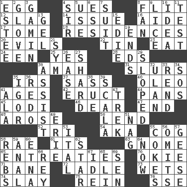 ACROSS 1. Ovum 4. Institutes legal proceedings 8. Secret move to avoid paying debts 12. Volcanic refuse 14. Come out of 16. Helper 17. Heavy book 18. Homes 20. Vices 22. Shallow baking pan 23. Ingest 24. Car or cant ending 25. Consenting reply 28. Begley and Asner 30. Housemaid 31. Runs notes together 35. Big collection agency 37. Backtalk 40. Margarine 41. Grows older 42. Spew [out] 44. Zero-star reviews 45. Farming town in central California 46. Letter starter 47. Conclude 48. Came up 50. Grant temporary use of 52. Three (prefix) 54. Alias (abbr.) 55. Gear tooth 58. Actress Charlotte 61. It is 63. Dwarf 65. Pleas 70. Migrant worker of the '30s 71. Object of repulsion 72. Dipping utensil 73. Moistens 74. Kill 75. It's straight from the horse's mouth 76. Compass dir. DOWN 1. First name in cosmetics 2. Michael Jackson trademark 3. Homeless child 4. Title for a knight 5. Purpose 6. Curvy letter 7. Set or collection 8. Air blower 9. Louse (plural) 10. The content of cognition 11. Trial 13. Set 15. Singer Brickell 19. Conclusions 21. Symbol (abbr.) 26. Relaxation 27. Broken piece 29. Inclined 30. Help 32. ____ Bator 33. Tear apart 34. Distress signal 35. Russian composer Stravinsky 36. Make new 38. Take to court 39. Any of the three canals of the cochlea 41. Chicken ___ king 43. Long journey 49. 4th largest of the Great Lakes 51. Tired old horse 53. Slanted text style (abbr.) 55. Popular sodas 56. Leaves out 57. Honkers 58. Confederate soldiers (slang) 59. Of or related to the anus 60. Inactive volcano in Sicily 62. Play the lead 64. At this time 66. Marina Del _, California 67. Binary compound 68. Biblical high priest 69. Elected rep.