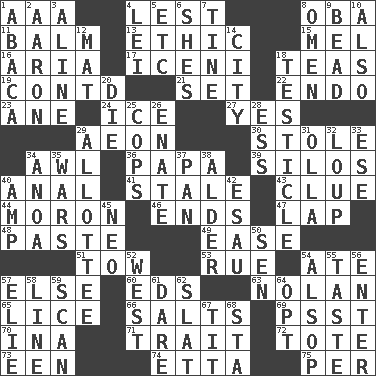 ACROSS 1. Auto club (abbr.) 4. For fear that 8. Chief or king in Benin or Nigeria 11. Lip ointment 13. Moral principle 15. Cartoonist voice _ Blanc 16. Roberta Peters solo 17. Ancient Celtic tribe of eastern Britain 18. Afternoon social gatherings 19. Continued (abbr.) 21. Put into a specified state 22. Inside; within (prefix) 23. One (Scot) 24. Frozen water 27. Consenting reply 29. Period of immesurable duration 30. Took without asking 34. Leather borer 36. Dad 39. Grain storage towers 40. Of or related to the anus 41. Showing deterioration from age 43. A slight indication 44. Person of subnormal intelligence 46. Conclusions 47. Pet locale 48. Thick mixture 49. Comfort 51. Pull behind 53. Sorrow 54. Had dinner 57. Otherwise 60. Begley and Asner 63. Pitcher Ryan 65. Louse (plural) 66. Table seasonings 69. Inconspicuous attention getter 70. _ tizzy (2 wds.) 71. Distinguishing feature 72. Haul 73. Car or cant ending 74. Singer James 75. For each DOWN 1. Phillipine bananalike plant 2. Composer Copland 3. Place in a line 4. Flowery wreath 5. And so on (abbr.) 6. "______ My Girl" (Turtles hit) 7. Prong on a fork 8. Sign of something about to happen 9. Necklace unit 10. In addition 12. Floor protector 14. Municipality 18. One of the two male reproductive glands 20. Expire 25. 911 reaches them 26. Maternal 28. Double-curved letter 29. One to whom something is allotted 31. Rounded earthenware pot or jar 32. Central Nebraska county 33. Compass dir. 34. Small Philippine buffalo 35. Armed conflicts 37. Baking dish 38. Tree or shrub in the Birch family 40. Electrical Unit 42. Son of Isaac 45. Modern: prefix 50. Elected rep. 52. Compass direction 54. Columnist Joseph or Stewart 55. Clothes sense 56. Keyboard key 57. Writer Wiesel 58. Actor's bit 59. Glance over 61. Have the gumption 62. Narrow board 64. Elect 67. Teat (slang) 68. R.R. building