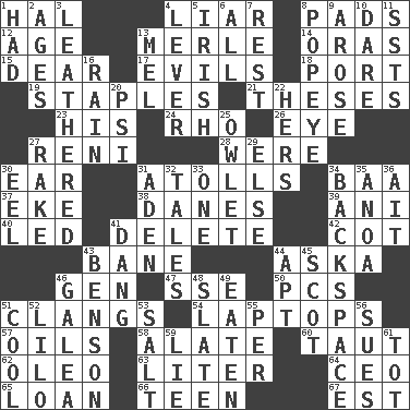 ACROSS 1. Actor Linden 4. One who doesn't tell the truth 8. Writing tablets 12. Mature 13. Haggard of country music 14. Mouths or openings 15. Letter starter 17. Vices 18. Left side of a ship or aircraft 19. Paper fasteners 21. College papers 23. Part of HMS, perhaps 24. 17th letter of the Greek alphabet 26. Sight organ 27. Painter Guido (1575-1642) 28. Past tense of be (plural) 30. Ewer handle 31. Ringlike coral islands and reefs 34. Sound made by sheep 37. Make supply last 38. Natives or inhabitants of Denmark 39. Cuckoo 40. Directed 41. Keyboard key 42. Small bed 43. Object of repulsion 44. "____ silly question..." 46. Commissioned mil. rank 47. Compass dir. 50. Personal Computers (abbr.) 51. Gives out a loud, resonant sound 54. Portable computers 57. Petroleums 58. Having winglike extensions 60. Tense 62. Margarine 63. 61 cubic inches 64. Corporate head (abbr.) 65. Grant temporary use of 66. Adolescent 67. Eastern Standard Time (abbr.) DOWN 1. Possessed 2. Ripens 3. Resembling or made to resemble leather 4. Prying instrument 5. From or relating to Ireland 6. 100% 7. Take ten 8. Wimpy's pal 9. Came up 10. Have the gumption 11. Fast planes 13. Cartoonist voice _ Blanc 16. Water falling in drops from the sky 20. 23rd letter of the Greek alphabet 22. Possessive pronoun 25. A small or young owl 27. Libertine 29. Otherwise 30. Snakelike fish 31. Arabian gulf 32. Stories 33. Single 34. Keyboard key 35. Small Philippine buffalo 36. Small island 41. Mild oath, euphamism for damn 43. Gillaume's butler role 44. Fitting 45. Highlander 46. An organ shaped like a helmet 48. Chalkboard 49. Eroded 51. Calm and collected 52. _ and Stitch 53. Table seasoning 55. For each 56. Takes to court 59. Falsehood 61. Small child