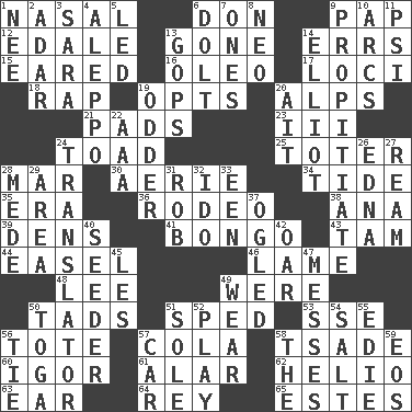 ACROSS 1. Relating to the nose 6. Spanish title 9. Infant food 12. Peak District village in England 13. Went 14. Blunders 15. Having ears or earlike features 16. Butter sub 17. Locales 18. Hit sharply and swiftly 19. Chooses 20. High mountains 21. Writing tablets 23. One more than two 24. Frog relative 25. Carrier 28. Impair 30. Nest on high 34. Event that recurs at intervals 35. Epoch 36. Cowboy competition 38. Santa ___, CA 39. Lairs 41. Beat drum 43. Scottish cap 44. Artist's stand 46. Unable to walk 48. Area sheltered from the wind 49. We are 50. Small boys 51. Moved rapidly 53. Compass dir. 56. Haul 57. Root beer relative 58. Sadhe (variant) 60. Russian composer Stravinsky 61. Having or resembling wings 62. Sun: prefix 63. Hearing organ 64. Marina Del _, California 65. _____ Park, CO DOWN 1. Born 2. The sixth month of the Jewish calendar 3. "Two Mules for Sister ____" 4. City in Syria 5. Directed 6. Stupid person 7. Singles 8. Modern: prefix 9. Appease 10. Arches 11. Air pressure measure (abbr.) 13. Republicans 14. American author Paul (1891-1958) 19. More peculiar 20. Small island 22. Auto club (abbr.) 24. Interpreter 26. Pulitzer Prize-winning author Ferber 27. 480, 500 or 516 sheets of paper 28. Ancient Persian 29. Length times width 31. Director Reiner 32. Wedding promise 33. Car or cant ending 37. Stared at amorously 40. Sowing specialist 42. Rowing implement 45. French article 47. Makes clutter 49. Erode 50. Ancient Roman robe 51. Flatfish 52. Live dramatic performance 54. Table seasoning 55. Singer Brickell 56. Standoff 57. 4-wheeled motor vehicle 58. Definite Article 59. Greek goddess of the dawn