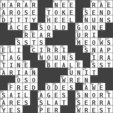ACROSS 1. Ethiopian city, capital of Harari 6. Born 9. Actress Charlotte 12. Came up 13. Casino tip 14. Transmit 15. Short, simple song 16. Person who is morally reprehensible 17. Religious women 18. Adept person 19. Exchanged or delivered for money 20. Went 21. Tail end 23. RI univ. 24. Fast planes 25. Catcalls? 28. Biblical high priest 30. High-altitude cloud 34. Fastener 35. Label 36. Parts of speech 38. Retirement account (abbr.) 39. Prong on a fork 41. Memphis, Tenn. Street 43. Fast jet (abbr.) 44. Believer in; advocate of (suffix) 46. A single undivided whole 48. Bear (Spanish) 49. Songbird 50. Flintstone 51. Lyric poems 53. Deep reverence 56. Travel by water 57. Matures 58. Derisive sound 60. Ancient Greek god of war 61. Narrow board 62. Spanish missionary in California 63. It is so 64. For each 65. Take or capture by force DOWN 1. Possessed 2. Roberta Peters solo 3. College mil. group 4. Michaelmas daisies 5. Marina Del _, California 6. Christmas carol 7. Made supply last 8. Snakelike fish 9. One who advocates reunion 10. Queen of England 1702-14 11. Begley and Asner 13. Son of Odin 14. Sounds asleep 19. Indian antelope 20. Chewing product 22. And so on (abbr.) 24. Seigniories (variant) 26. Armed conflicts 27. Petty quarrel 28. Singer James 29. Den 31. Director Reiner 32. Regret 33. _ tizzy (2 wds.) 37. Plays smoothly or legato 40. Artist's stands 42. Compass dir. 45. Allow head to fall sleepily 47. Sillier 49. Compass direction 50. Conductor's collection 51. Stare at amorously 52. Letter starter 54. Had on 55. Blunders 56. Declare 57. Cleo's killer 58. Compass dir. 59. Make lace