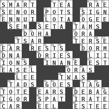ACROSS 1. Don Adams' spy role 6. Beverage made from leaves 9. Actress Charlotte 12. Sir (Sp.) 13. Plant holders 14. Omen 15. World-weariness 16. Globular water bottle used in Asia 17. Double curve, resembling the letter S 18. Elected rep. 19. Stalk of a moss capsule 20. Scottish caps 21. Capital of the state of Qatar 23. Mouth or opening 24. Russian ruler of old 25. Laconic 28. Ewer handle 30. Musical pauses 34. Dormintory (informal) 35. Heredity factor (abbr.) 36. Frees from moisture 38. Cards in a Roman deck? 39. Charged particles 41. Silly 43. Eastern Standard Time (abbr.) 44. Artist's stand 46. Mouths or openings 48. Area sheltered from the wind 49. It was, poetically 50. Small amounts or degrees 51. Travels 53. Label 56. Lug 57. Hearing organs 58. Debunk (Brit. slang) 60. Russian composer Stravinsky 61. Argument over a trivial matter 62. Feeling or showing extreme anger 63. Automobile 64. Snakelike fish 65. First name in cosmetics DOWN 1. Compass dir. 2. Not women's 3. Singer Murray 4. Periods in a boxing match 5. Three (prefix) 6. A blast of a horn 7. Singer James 8. White ___ sheet 9. Frustrating wastes of time 10. Ripens 11. Compass dir. 13. Entreaty 14. Flew 19. Fragment 20. Small child 22. Boat paddle 24. Interpreter 26. Indian titles of respect 27. Send forth 28. Singer Brickell 29. Small Philippine buffalo 31. Indian title of respect (Mr.) 32. Shallow baking pan 33. Ocean 37. Overwhelms 40. Sowing specialist 42. Period 45. French article 47. Michaelmas daisies 49. Trial 50. Ancient Roman robe 51. Yawn 52. Taken by mouth 54. Blind as ____ 55. Yard entry 56. Nervous spasm 57. Compass dir. 58. Pass on 59. Turn to the right