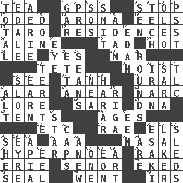 ACROSS 1. Afternoon social gathering 4. Global Positioning Systems (abbr.) 8. Close up, plug up 12. Wrote a lyric poem 14. Odor 16. Snakelike fish 17. Edible starchy tuberous root 18. Homes 20. Place in a line 22. Bit 23. Being at a high temperature 24. Area sheltered from the wind 25. It is so 28. Make imperfect 30. Wig 31. Wet 35. Perceive with the eye 37. Hyperbolic tangent 40. Mountain range 41. Having or resembling wings 42. Approach 44. Drug cop 45. Old wives' tales, e.g. 46. Indian skirt 47. Heredity factor (abbr.) 48. Portable shelters 50. Ripens 52. And so on (abbr.) 54. Actress Charlotte 55. Raised railways 58. Ocean 61. Auto club (abbr.) 63. Relating to the nose 65. Abnormally rapid or deep breathing 70. Libertine 71. One of the Great Lakes 72. Sir (Sp.) 73. Made supply last 74. Lick closed 75. Gone 76. Big collection agency DOWN 1. "_____ Recall" 2. Peak District village in England 3. Nest on high 4. Slender fish 5. Before (prefix) 6. Mayday 7. Stricken, poetically 8. Elected rep. 9. Technology 10. Butter sub 11. Inconspicuous attention getter 13. Spanish title 15. First man 19. Dutch treat 21. Sight organ 26. Singer James 27. Seines 29. Periods in a boxing match 30. Cylindrical with tapered ends 32. SW Asia republic 33. "Two Mules for Sister ____" 34. Affectionate concern, for short 35. _ gin 36. Merit 38. Teachers' org. 39. Ethiopian city, capital of Harari 41. Keyboard modifier key 43. Capital of Latvia 49. Play the lead 51. Car or cant ending 53. Balmoral and tarboosh 55. 1973 Nobel Price Winner (Physics) Leo 56. Member of a famous L.A. basketball team 57. Bobsleighs 58. "______ My Girl" (Turtles hit) 59. Jane of fiction 60. Capital of Western Samoa 62. Afresh 64. "We ___ not amused" (Victoria) 66. Snakelike fish 67. Single 68. Period of immesurable duration 69. Nonscientific branch of learning