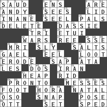ACROSS 1. Saudi Arabian king (1953-1964) 5. Followers of ems 8. "We ___ not amused" (Victoria) 11. "60 Minutes" Commentator Rooney 12. Observes 14. Flaplike covering 15. Lacking in sense or substance 17. Sew up the eyelids of hawks and falcons 18. Friends 19. Erase 21. Small ungulate mammals of Africa 23. Three (prefix) 25. Needle holder 26. Armed conflicts 27. To separate or throw off 28. Compass dir. 31. Medical imaging device (abbr.) 33. Playfully artful 35. Table seasonings 37. Highlander 38. Snakelike fish 40. Spoils 41. Wear away 43. Plant excrement 45. _ moment's notice (2 wds.) 46. French article 47. Two (Sp.) 50. SW Asia republic 52. Pile 53. To free from 54. Right away 56. Makes clutter 61. One third of a yard 62. Israeli folk dance 65. Relating to or accompanying birth 66. Bear (Spanish) 67. Fastener 68. Airs 69. Baseball player Mel 70. Put into a specified state 71. Moved rapidly DOWN 1. Alleged 2. Singer Murray 3. Hereditary estate 4. Centimeter-gram-second unit of force 5. Double-curved letter 6. Born 7. Sowing specialist 8. Mountain range southwest of Kyrgyzstan 9. Cause heat under the collar 10. Begley and Asner 13. Schedule 16. Singer James 18. Air pressure measure (abbr.) 20. Blunders 22. Institutes legal proceedings 24. Small island 26. Rampant 28. Notch 29. Portico 30. Eastern Standard Time (abbr.) 31. Female horse 32. Vintage cars 34. Affirmative reply 36. Actor Alda or Thicke 37. Set 39. Den 42. Genesis locale 44. Demure 48. Curses 49. Soup utensils 51. Arabian gulf 52. Being at a high temperature 54. Mail 55. Carrot, for example 57. Plant excrements 58. Close up, plug up 59. Comfort 60. Downhill vehicle 61. Egg _ yung 63. Actress Charlotte 64. Fitting